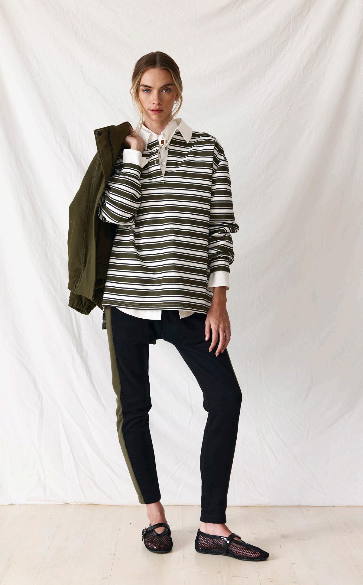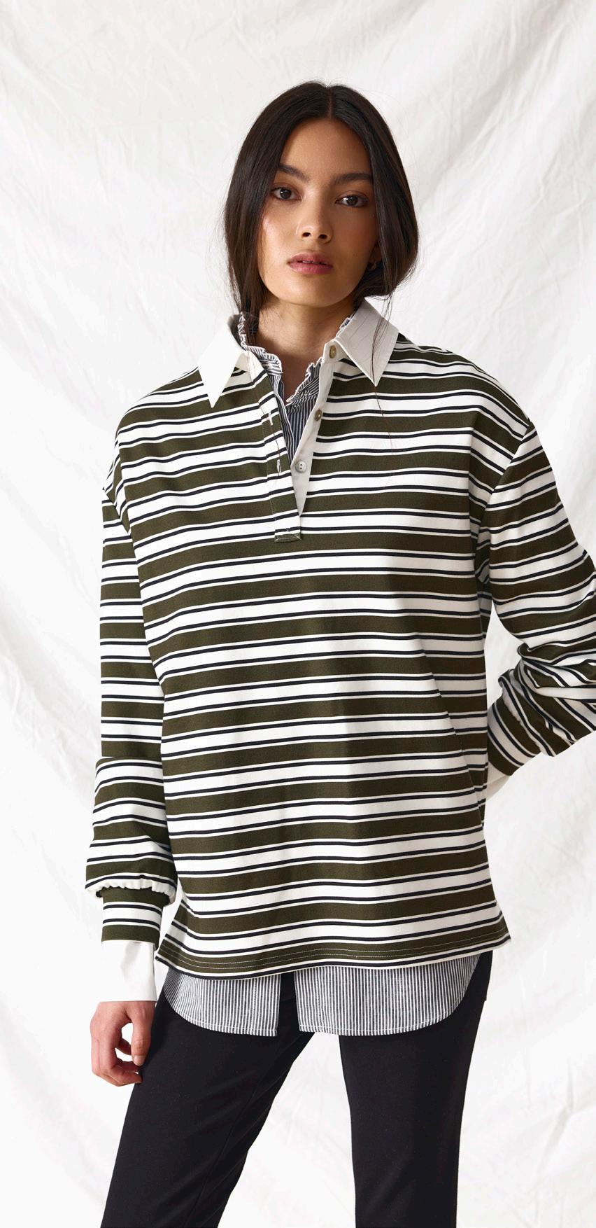 #7121 eli rugby jumper. olive stripe options. black stripe
