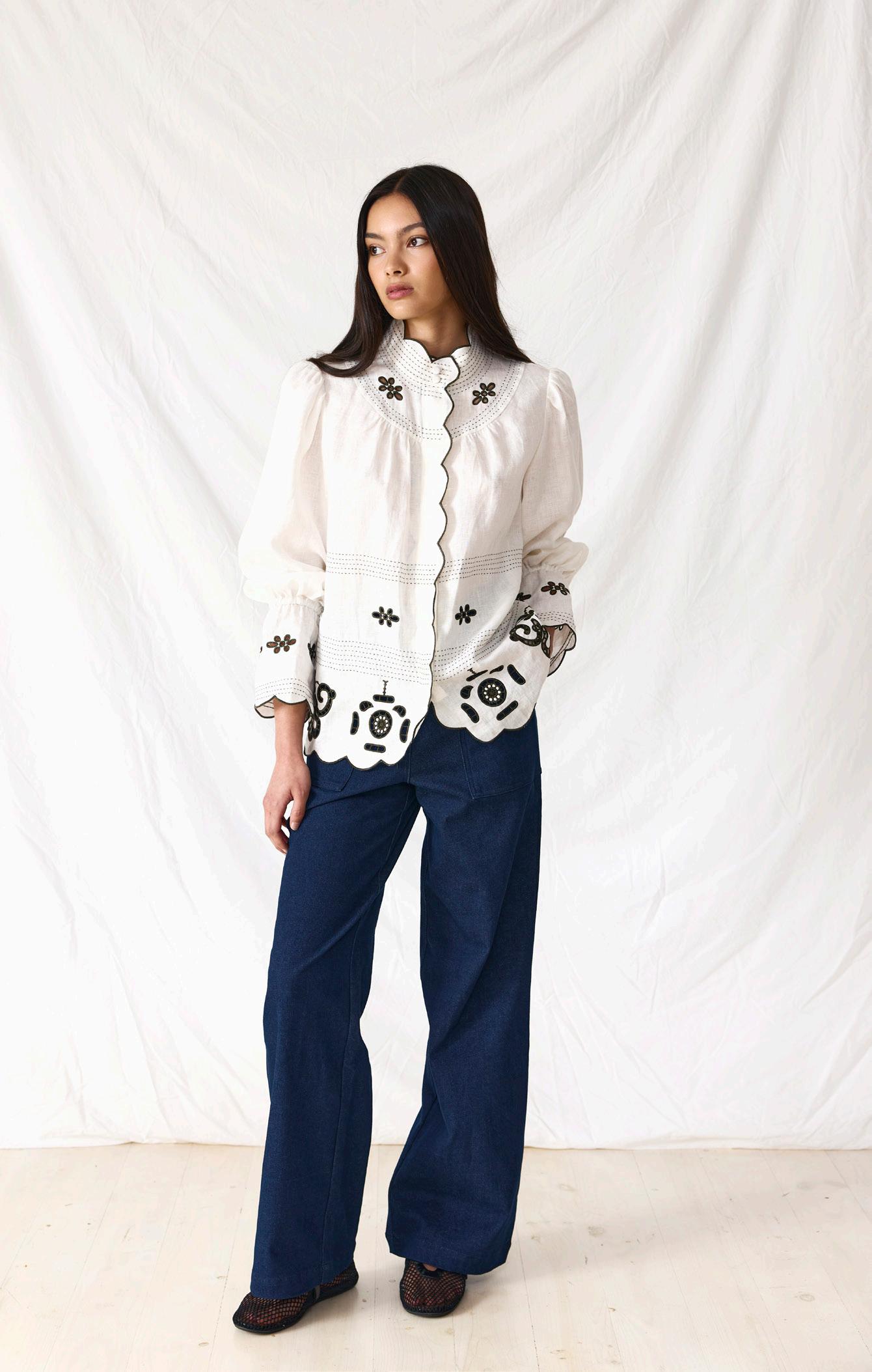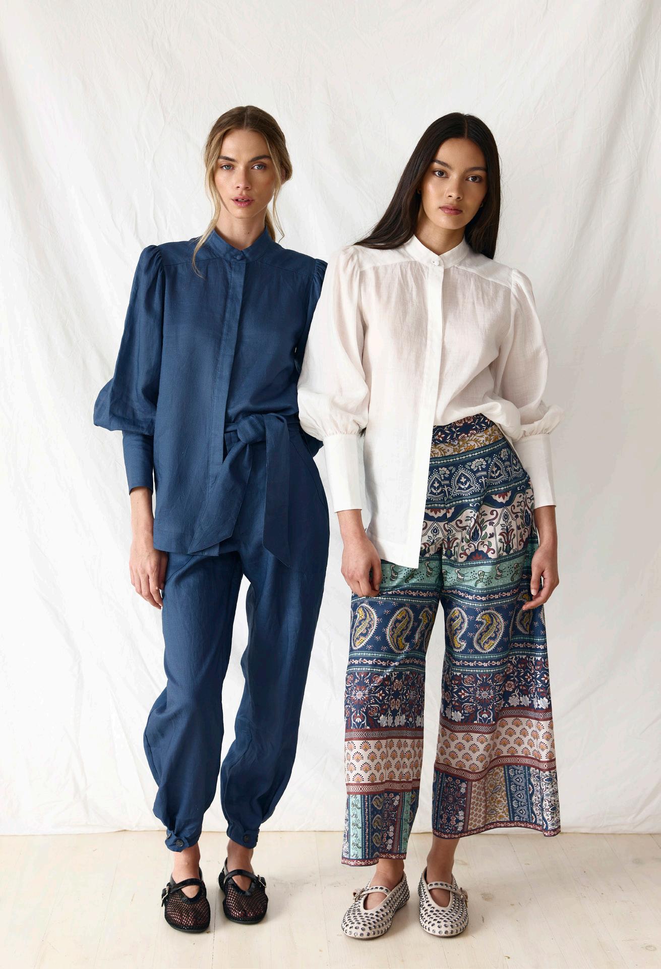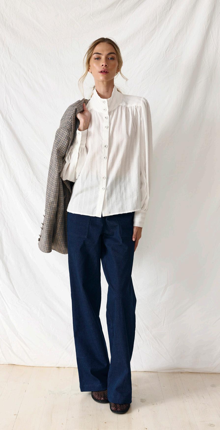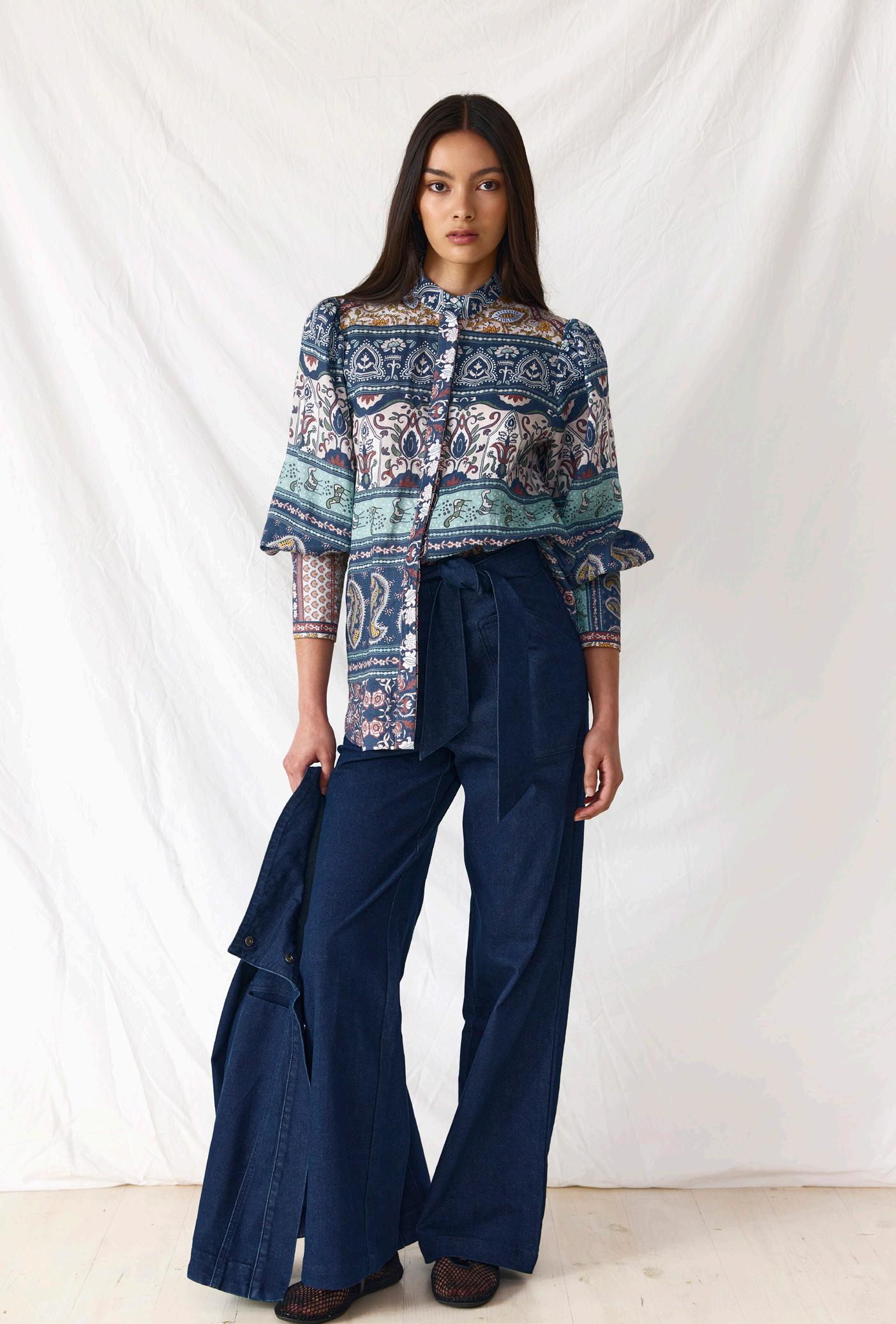 #3602 ona shirt. fiesta print option. chalk + marine #9671 sam jean. indigo
