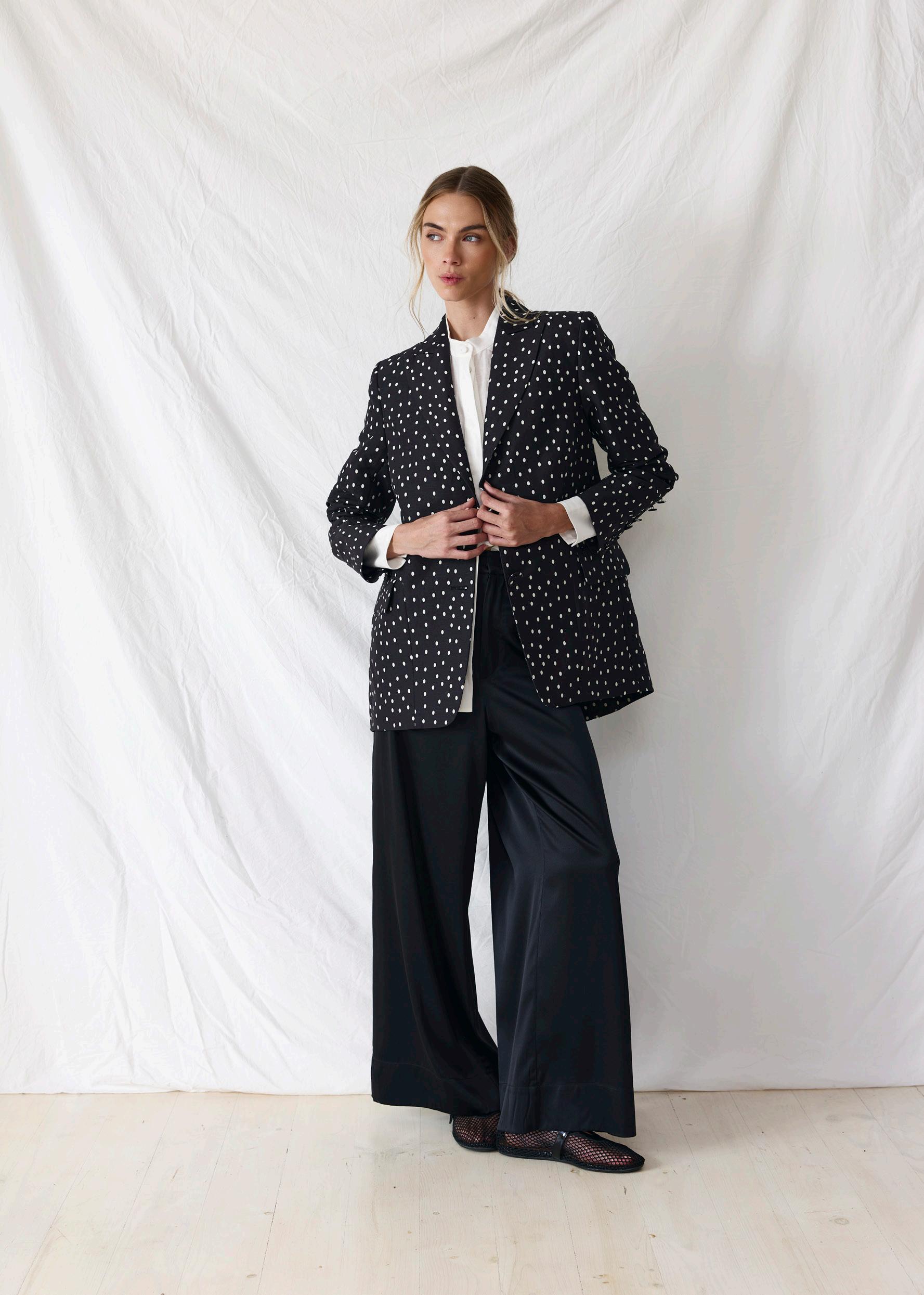 #5158 harley blazer. black spot #3602 ona shirt. chalk options. marine + fiesta print #9668 gina pant. black options. olive spot + black spot + olive