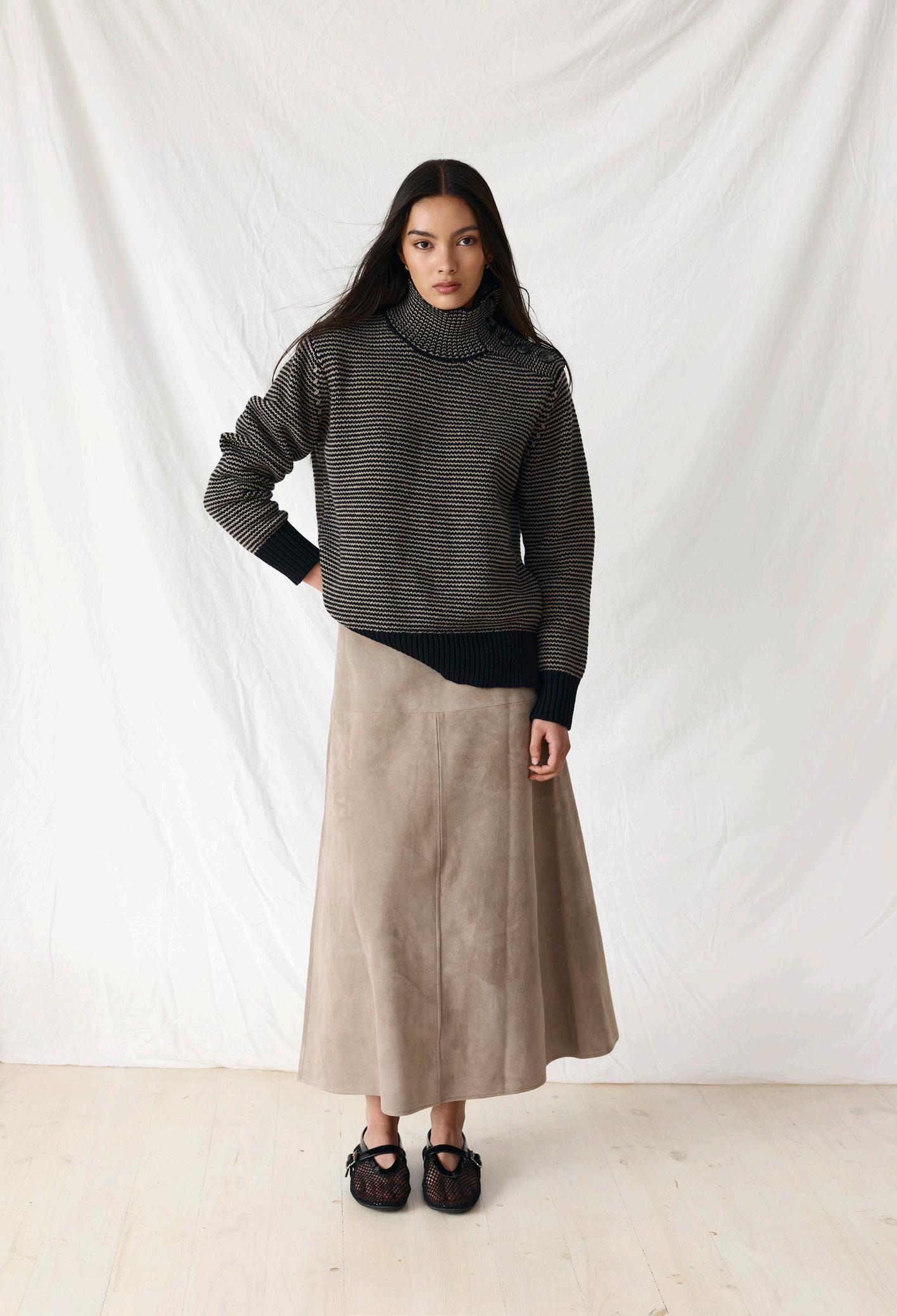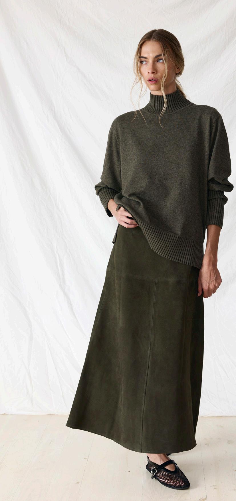#7113B anaise knit. black/nougat #8332 mae suede skirt. biscotti options. olive
