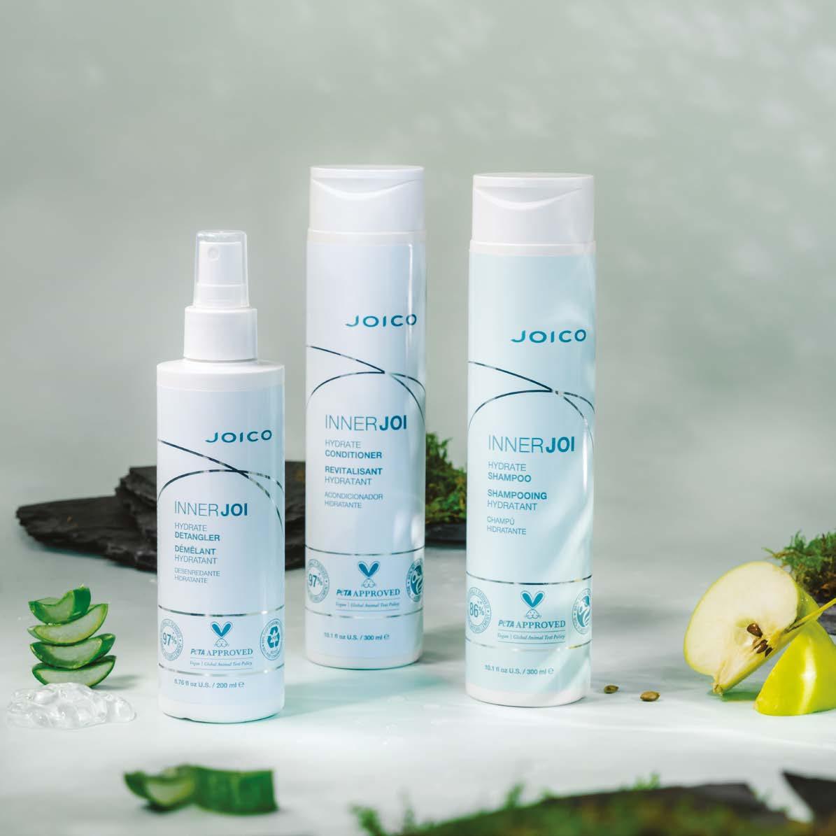 Onze INNERJOI HYDRATE-formules (met geüpcycled appelextract) zorgen de hele dag voor hydratatie zodat het haar er gezond uitziet, terwijl de hoofdhuid ook fris en gehydrateerd aanvoelt.