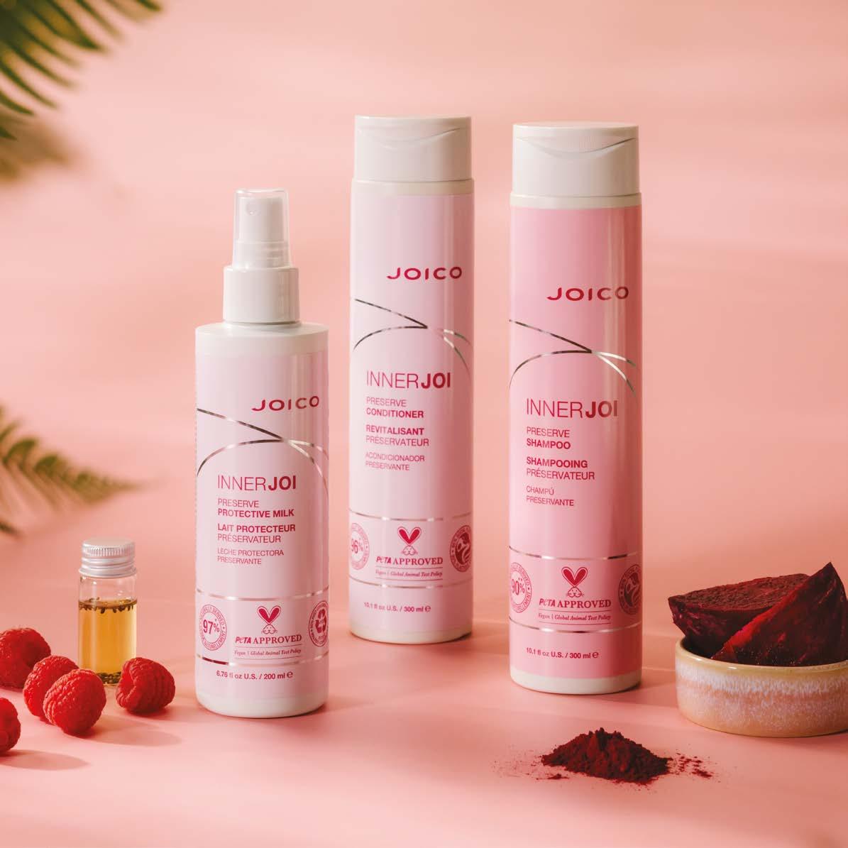 Onze INNERJOI PRESERVE-formules, met geüpcyclede frambozenzaadolie en bietwortelextract, zijn speciaal ontwikkeld om kleurverlies tegen te gaan. Geef je haar precies de verzorging en kleurbescherming die het nodig heeft zodat de kleur langer levendig blijft, alsof je net van de salon komt.