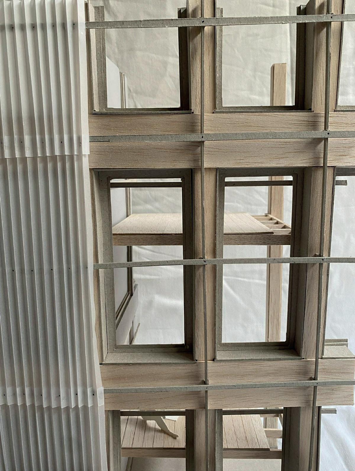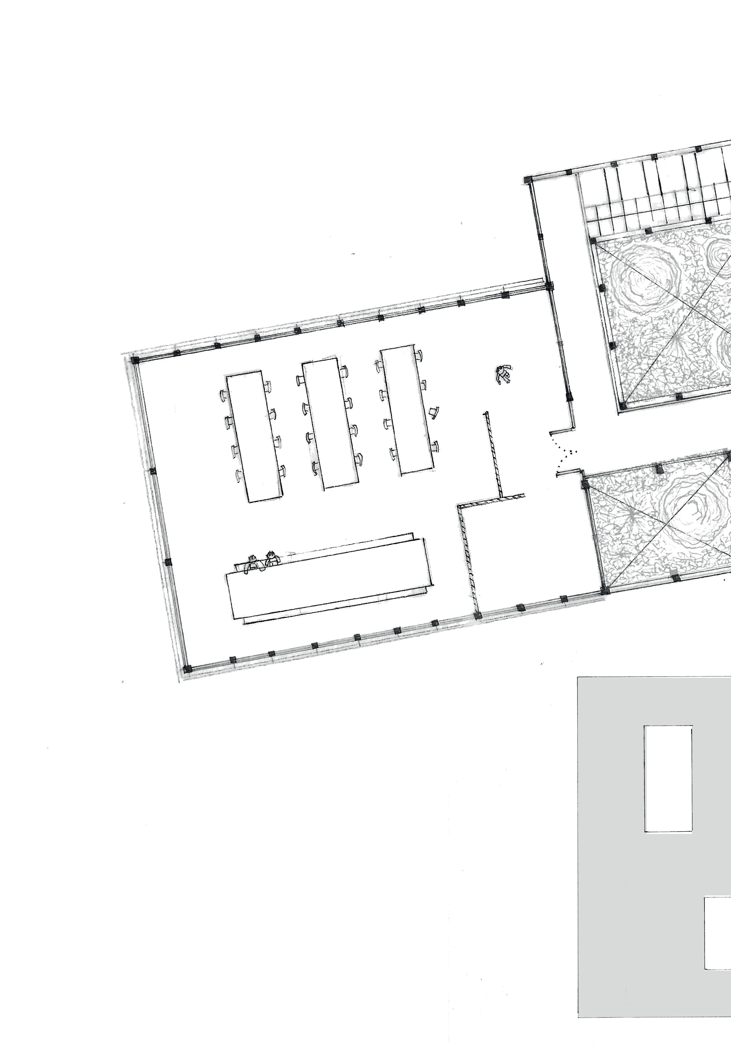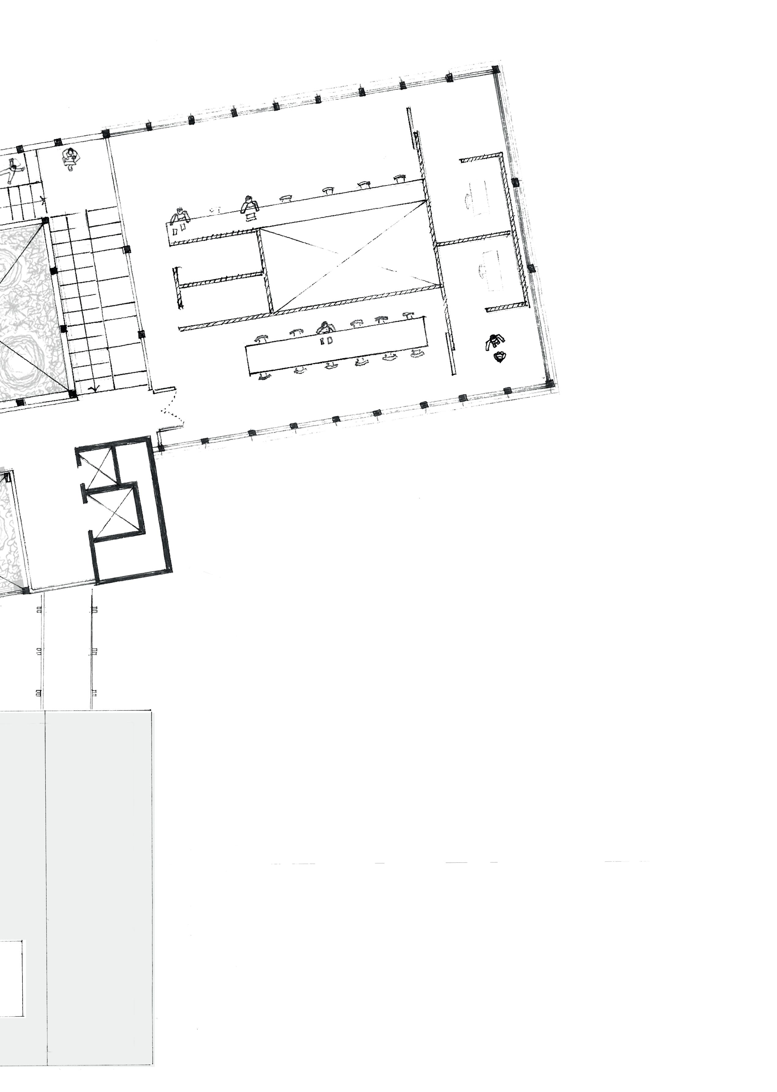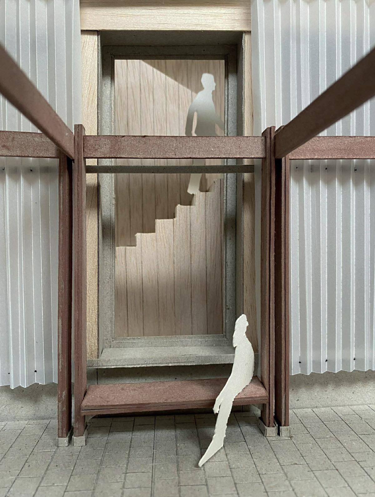 The third layer focuses on creating intimate, small-scale spaces within the large-scale existing structure, inspired by the Japanese concept of suki. Here, emptiness is deliberately used to enhance the architecture: the existing structure functions as an open framework in which light, new elements define the spaces. Subtle interventions such as a lowered roof, a hinged floor or small differences in height create spaces with their own atmosphere, without completely enclosing them with walls. These elements recur on each floor and offer space for rest, privacy and personal moments. Their light and flexible construction allows for future reprogramming. In addition, a green zone is introduced along the plot boundary, creating distance from the surroundings and making use of shade plants.