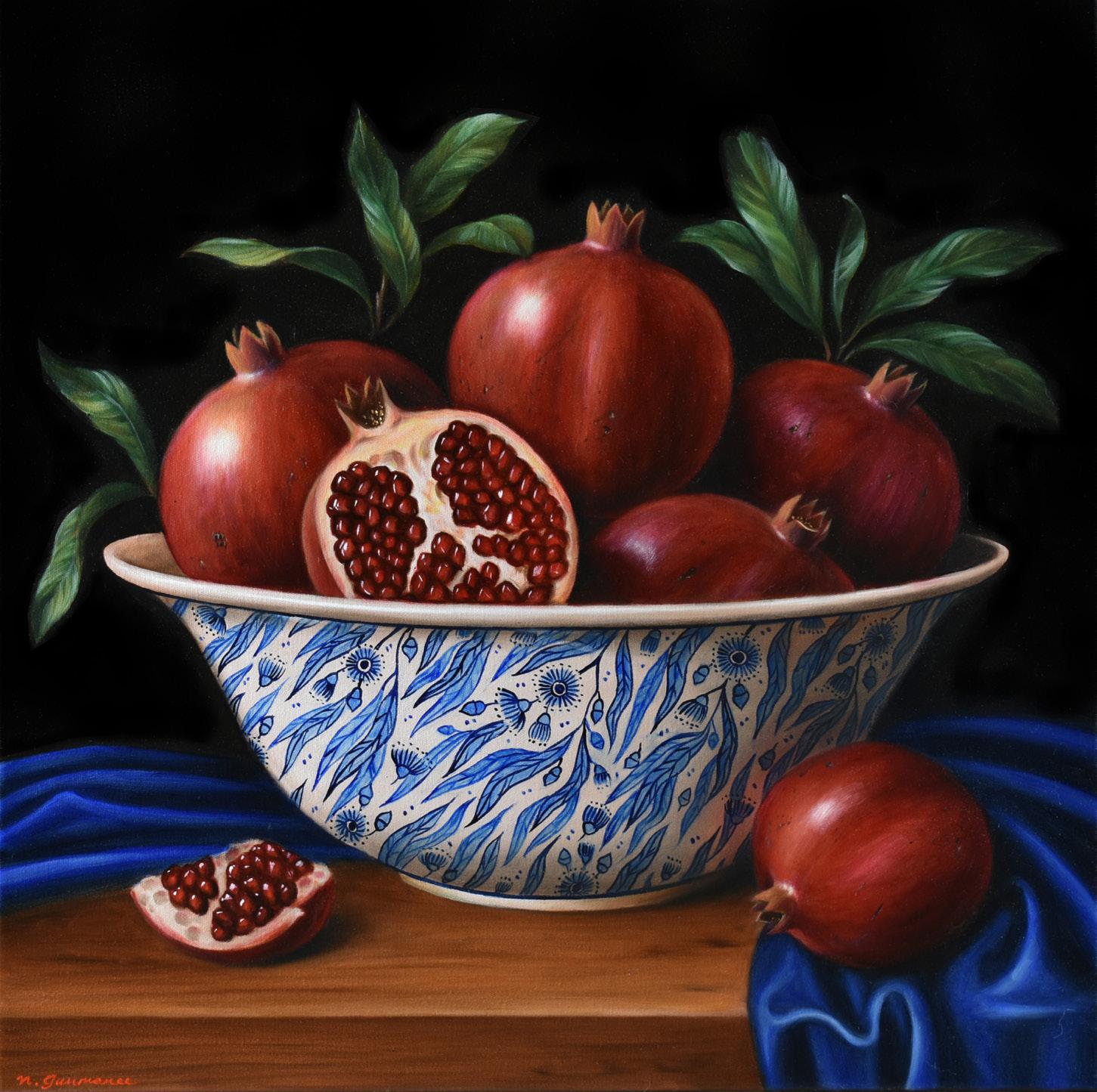 Left: Natasha Junmanee, Bowl of Pomegranates, 2026, oil on linen, 50x50cm | $2,800