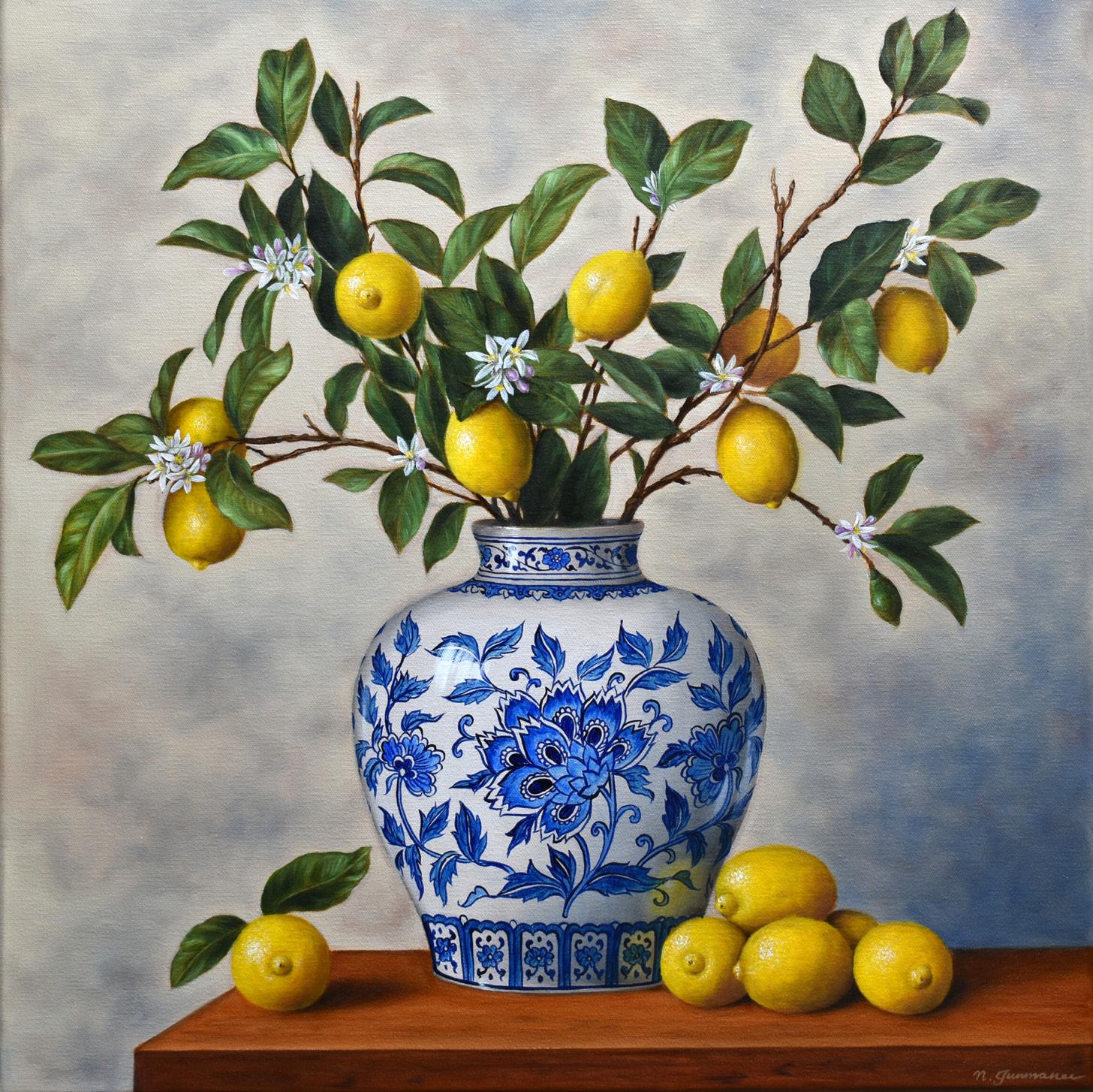 Front: Natasha Junmanee, Vase of Lemon Branches, 2026, oil on canvas, 50x50cm (detail)