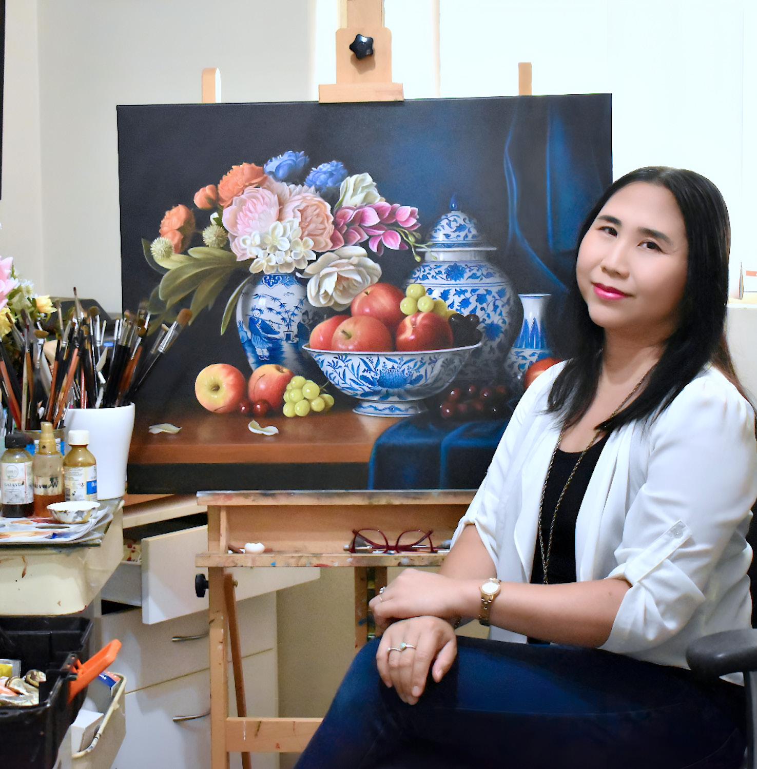 21. Natasha Junmanee, Blue and White Collection with Peonies, 2025, oil on canvas | $5,500