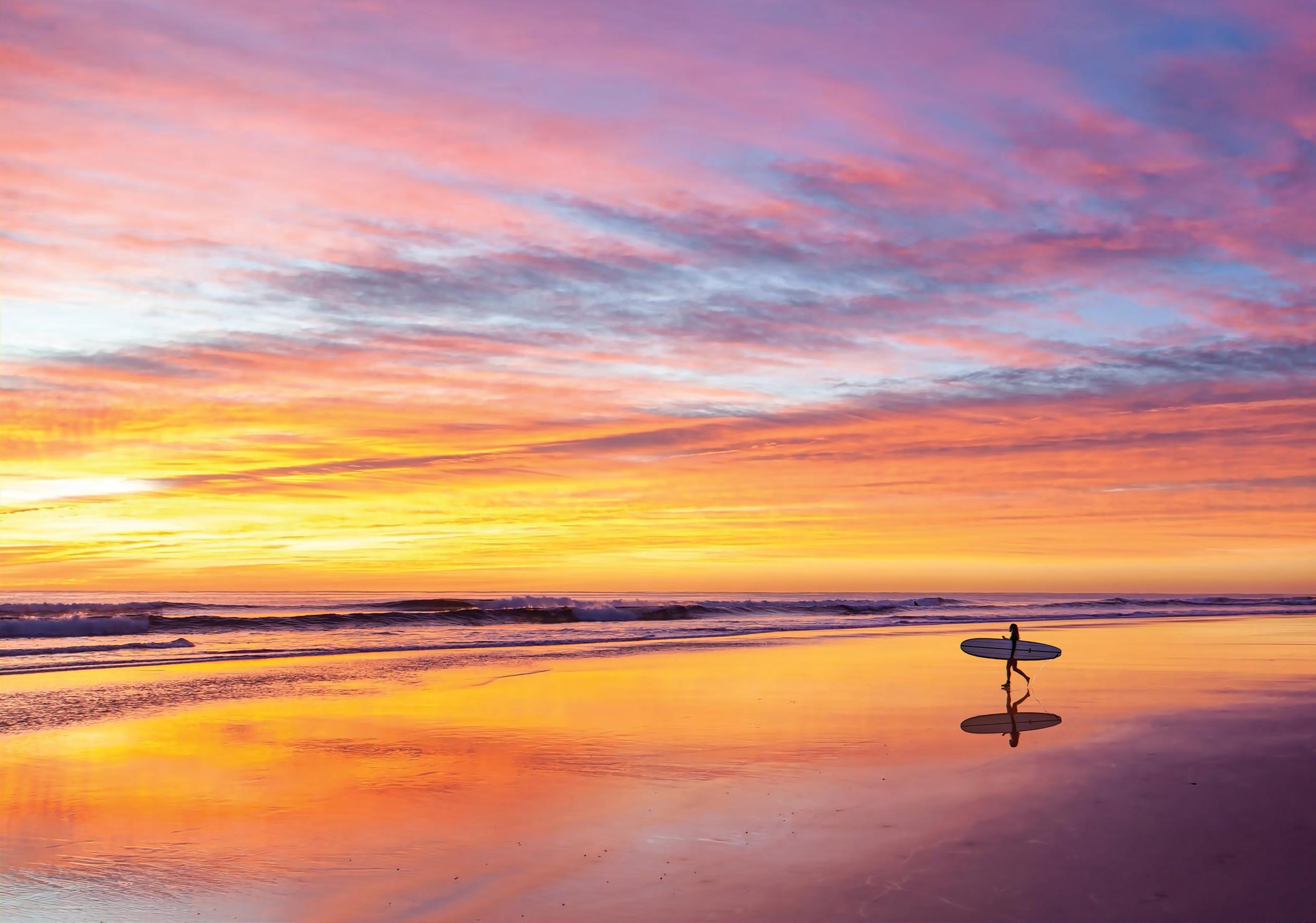 Some of the most amazing skies are captured at dawn when the weather report forecasts rain. I get out every morning regardless and walk with my camera, all senses alert, waiting for stories to unfold. The low tide slick provided the perfect mirror for the rich sky and surfer. This image was taken 30 minutes before sunrise on Coolum Beach. Handheld at 1/60 f.5 ISO 800.