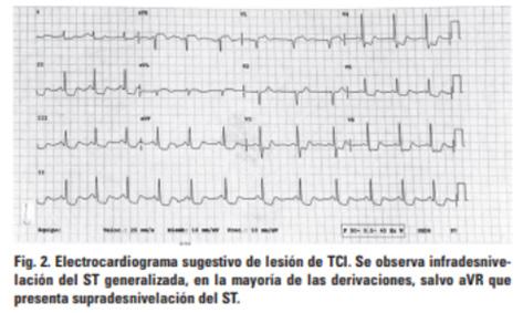 5. ECG sugestivo de lesión de tronco coronario izquierdo. Se caracteriza por un descenso generalizado del ST en todas las derivaciones, salvo aVR, en la que existe ascenso del ST (fig. 2) 1,5.