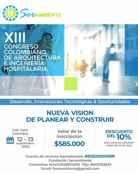 gresos nacionales anuales de arquitectura e ingeniería hospitalaria. Audiencia promedio de 280 asistentes, entre 2.008 hasta 2.023.