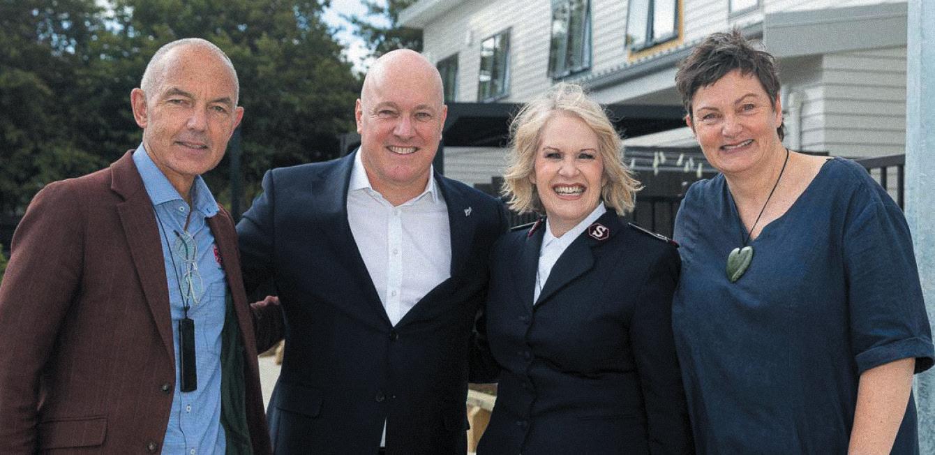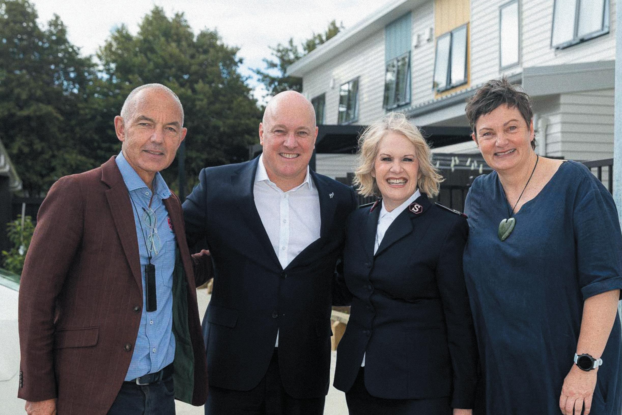 Above (from left): Greg Foster, director of Social Housing, Rt Hon Prime Minister Christopher Luxon, Territorial Commander Commissioner Janine Donaldson, Fiona Matthews National Housing operations manager. Photos by Ida White Lynx Photography.