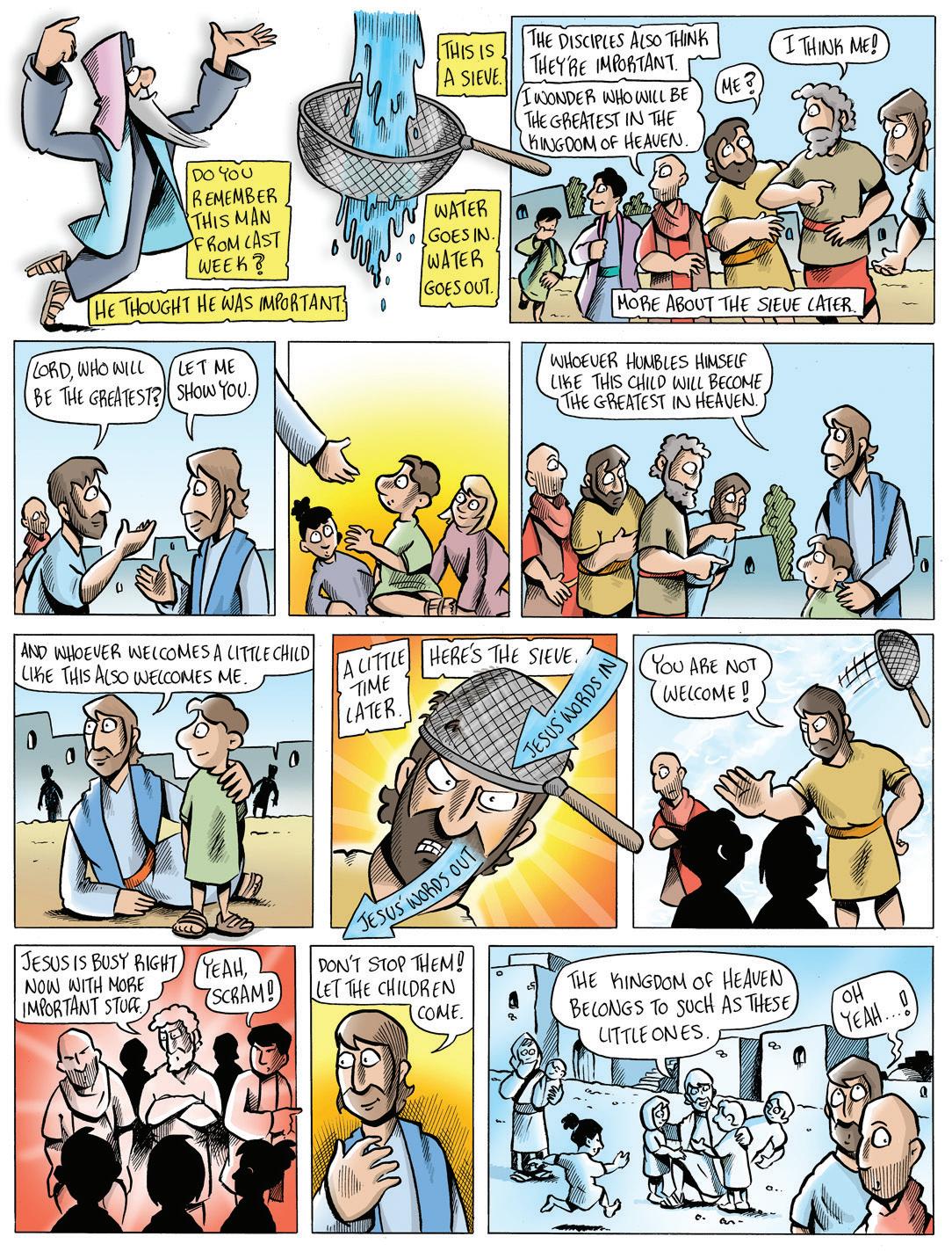 In this week’s Bible cartoon the disciples get into an argument about which of them is the ‘GOAT’. They want Jesus to tell them which of them is considered the greatest. However, Jesus’ answer wasn’t the one they were expecting – he said that the best people are like children. He used kids as an example of how the disciples should think and behave.