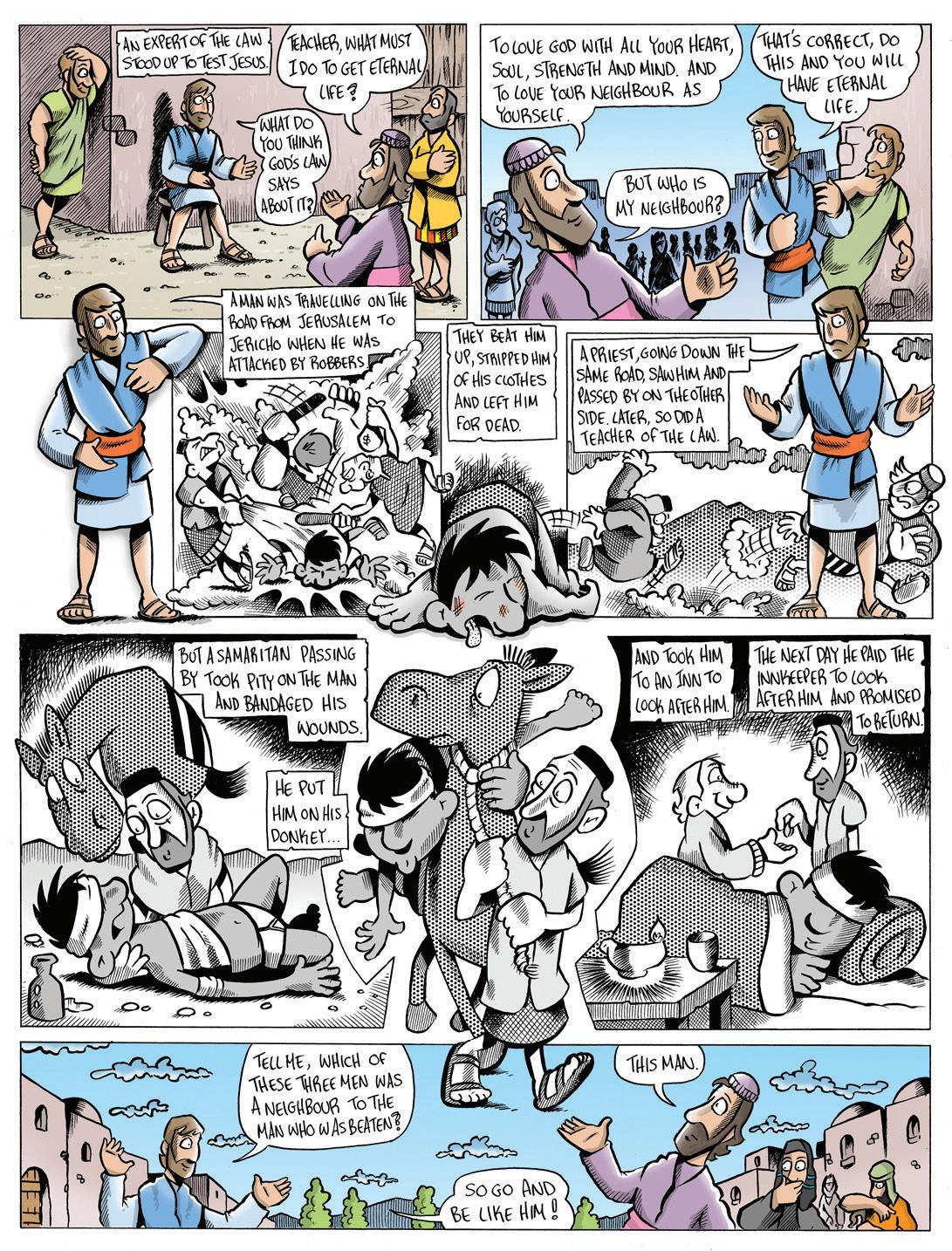 Maybe that’s who the teacher of the law in this week’s Bible cartoon thought his neighbour was–one of his favourite people. It’s easy to be nice to our favourite people, but Jesus said Christians should do something more. It was the Samaritan–someone the teacher of the law disliked and would never have spent time with – who was the man’s neighbour in Jesus’ story.
