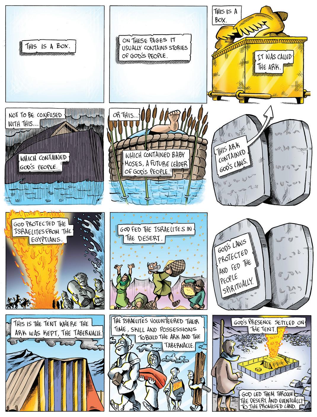 In this week’s Bible cartoon we see an extraspecial box that God asked the Israelites to make. The Ark of the Covenant was where the Ten Commandments were stored. Not only did God ask the Israelites to make the Ark, he also asked them to make an extra-special building to keep it in – the Tabernacle.