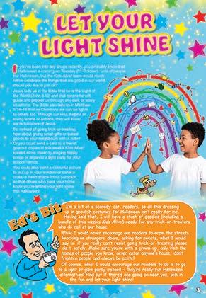 Rather than trick-or-treating, isn’t it a much nicer idea to do kind things for others? Some Christians deliver small gifts to neighbours at Halloween or give away copies of Kids Alive! Jesus would like this idea, because in Matthew 5:16 he said Christians should ‘Make your light shine, so others will see the good you do and will praise your Father in Heaven’ (CEV).