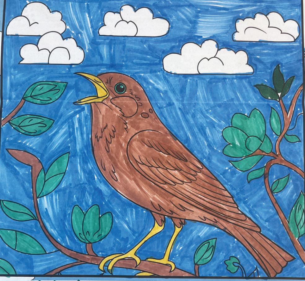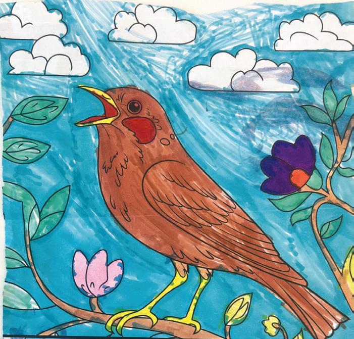 Here’s another awesome Bird Colouring by Rosie, aged 8. This bird looks very happy singing its morning song! We love the colourful flowers –well done, Rosie!