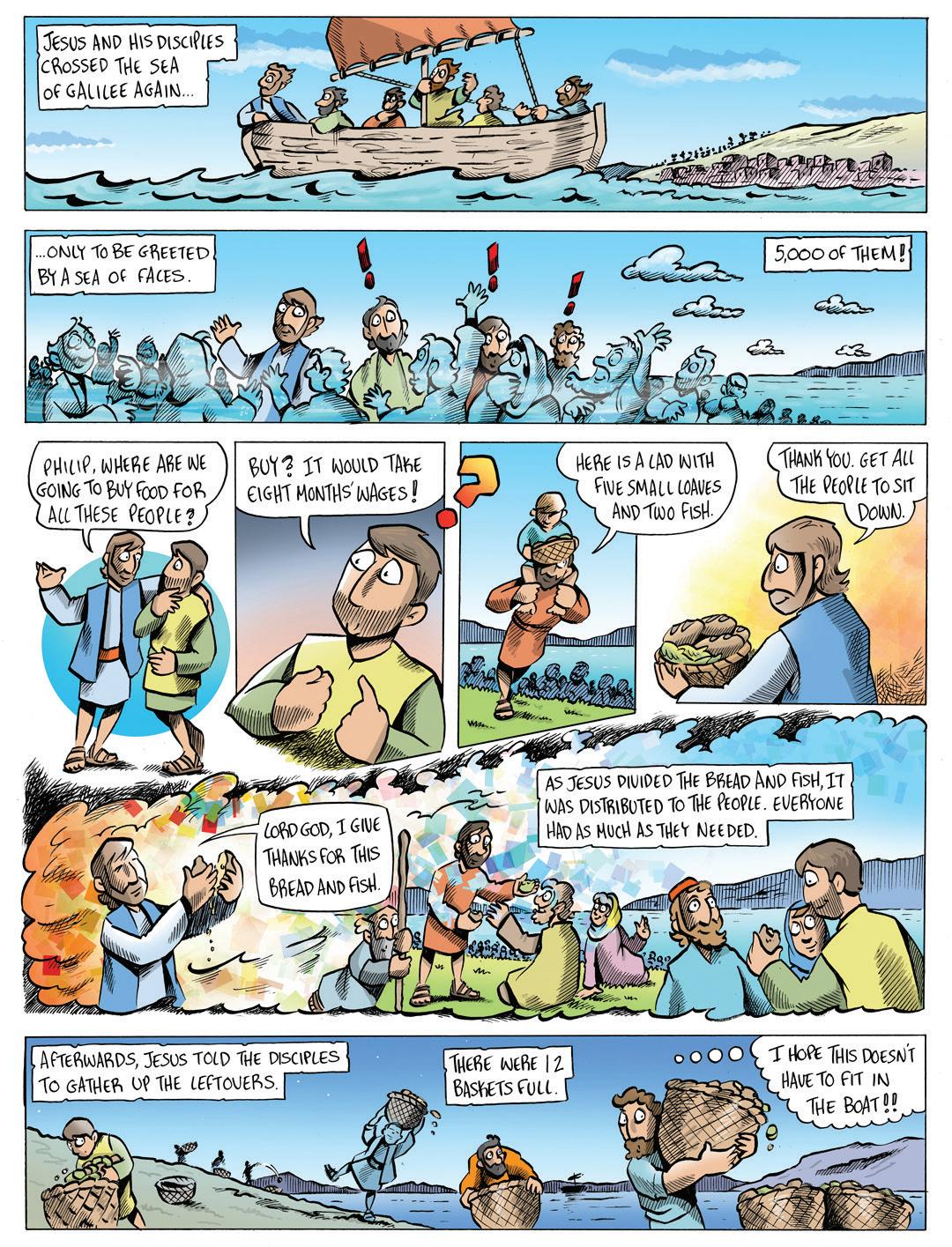 In this week’s Bible cartoon, Jesus also saw a need. A huge crowd had been following him all day, listening to him teach. As evening came, people began to feel hungry. Jesus didn’t ignore them or tell the crowd to sort it out themselves. Instead, he cared for them and made sure they were looked after.