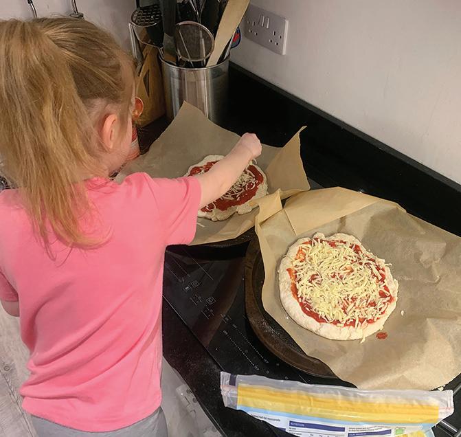 Ask a grown-up to remove the baking trays from the oven and lay the pizza bases on them. Then bake the pizza bases for about four minutes, before removing them from the oven. Add as much pizza sauce as you’d like to the pizza bases.
