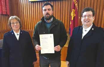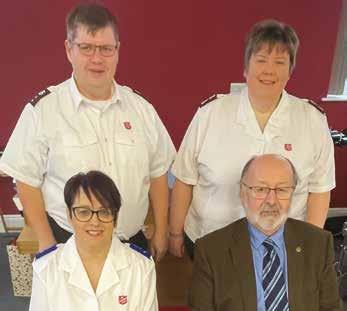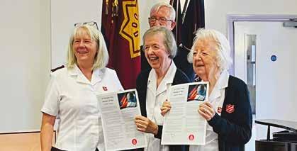 KATH Antony was enrolled as a soldier and Pam Blackie was welcomed as an adherent by corps leader Lieutenant Bethany Perkins. Both ladies are friends and sisters in Christ and volunteer at Sam’s Tots each week, where they enjoy helping with crafts and getting covered in glue or paint! They readily take up other volunteering opportunities too. Kath first came to Sam’s Tots with her grandson about 10 years ago, before becoming involved in it when he went to school. She always felt the presence of God when she entered the building and felt drawn to worship but was already worshipping at another church. After Covid-19 restrictions were lifted she took the opportunity to try services at the hall and found this was where God wanted her to be. Kath was approached about becoming an adherent and she jumped at the chance, but God had other ideas. She felt she ought to become a soldier but did not feel as good as others around her, as she had not been brought up in The Salvation Army. She then remembered the song ‘Beautiful Lord, Wonderful Saviour’ (SASB 355) and realised she could become a soldier with God beside her. Pam first attended with Kath about three years ago. Everyone was so welcoming and she knew this would be a beautiful place to worship. The words above the entrance doors say it all for her, ‘Come ... now is the time to worship!’ – BP