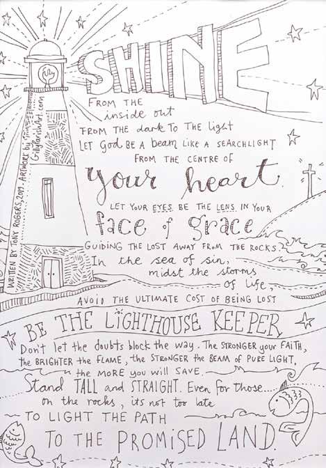 Gillian Lighthouse is drawn in black pen on white paper. Usually, my art is inspired by Scripture but, sometimes, other Godled words find their way into my creations. Tony’s poem gave me the chance to illustrate themes very close to my heart – light, grace and redemption. Although I worship at a different church now, those themes remain central to my worship, my creativity and my understanding of who and where I am in God’s Kingdom.