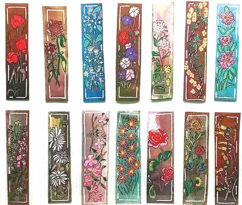 A friend found a dusty, rolled-up piece of leather at the back of his shed and gave it to me to ‘do something with’. After cleaning the surface and cutting it into manageable strips the size of bookmarks, I looked for inspiration. I found it in a book about flowers I bought earlier that week secondhand from the SATCoL Filton Donation Centre. This was exactly what I needed so I began to sketch a variety of flowers on to the smooth surface using pencil. I then added colour using acrylic paint and pens.