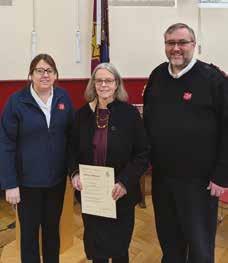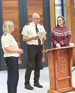 KATH Naughton-Marsden was welcomed as an adherent by corps leader Captain Michael Hutchings on Covenant Sunday. In her testimony, Kath told how she was part of a Christian family as a child and was baptised at age 15, but never really developed in her faith until she came to Messy Tots at the corps with her granddaughter. She started to help there, going home covered in paint, glue and glitter. From there she started to attend Sunday meetings and has been overwhelmed by the loving community she has found and feels that she is coming closer to God as her faith grows. Also pictured is Mavis Grills, who helped Kath on her journey. – PW