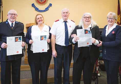 GARETH Rowe and Edan Scales were enrolled as soldiers by corps leader Captain Keith Scales. Gareth, who is new to the Army, testified that he has found healing within the joy and belonging at the corps, which led to the decision to be a part of what his son describes as ‘the happy church’. Edan grew up within the Army and described his ‘uprooting as a child by his officer parents as a good thing for him’ and thanked his church family for continuing to encourage him in his faith. Gareth and Edan are pictured with Captain Keith, Recruiting Sergeant Ann and Songster Leader Stuart Hook. – FS