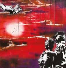 The pictures were painted roughly on old wooden pallets with a mixture of acrylic and spray paint, using Banksyish stencils and free hand.