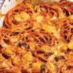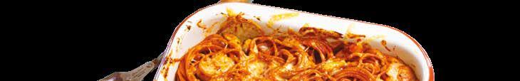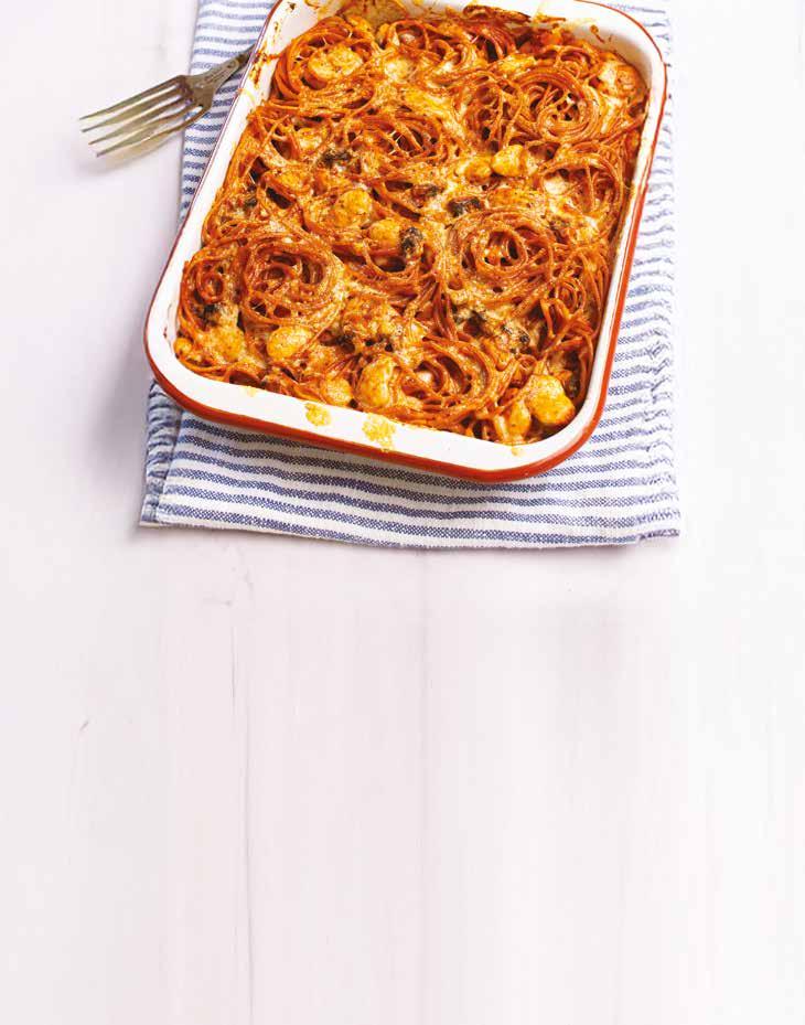 Drain the spaghetti when cooked and add to the sauce, mixing thoroughly. Pour into an ovenproof dish. Sprinkle the cheddar over the top and bake in the oven for 10 minutes. Serve immediately.