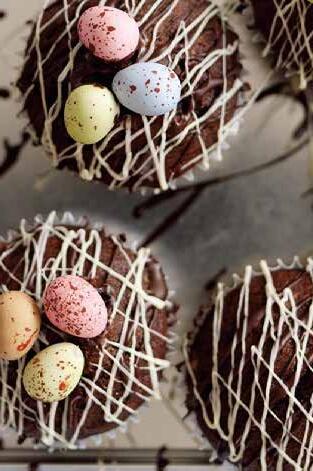 Melt the white chocolate and drizzle over the muffins. Decorate with the mini Easter eggs, to serve.