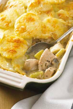 Pour the chicken mixture into an ovenproof dish. Arrange the potato slices on top so they overlap. Sprinkle the cheese on top.