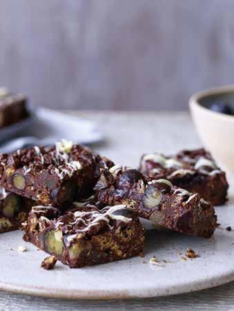 Add the blueberries, biscuits and stem ginger into the chocolate mixture and mix well, then press into the tin, smoothing the top.