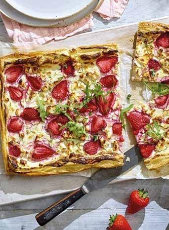 2cm from the edge down each side. Combine the soft cheese, chives, lemon zest and some pepper and spread over the pastry. Scatter over the feta and strawberries and bake for 25-30 minutes, until golden and puffed up.