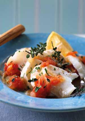 Sprinkle the tomatoes, onion, basil and most of the thyme around the cod, and season with salt and pepper. Place in the oven and roast for 20-25 minutes, until the cod is tender.