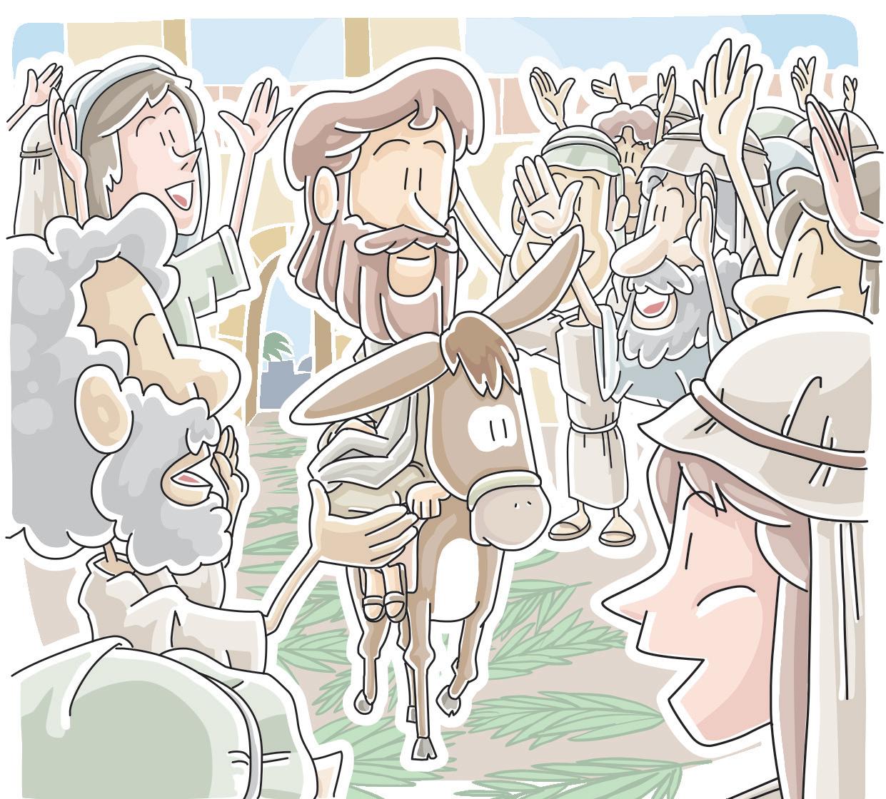 As Jesus entered the city, lots of people put their coats on the road. Others cut branches from the trees and spread them on the road. They praised God and shouted, “Blessed is He who comes in the name of the Lord.”
