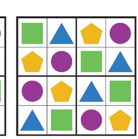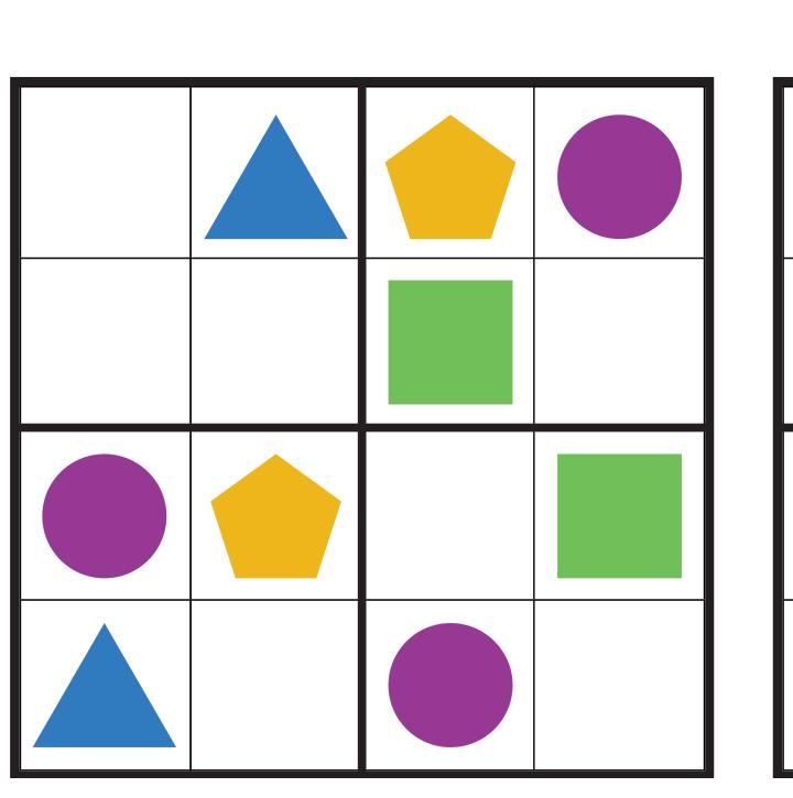 Fill in the squares so that each row, column and 2x2 box contains each shape.
