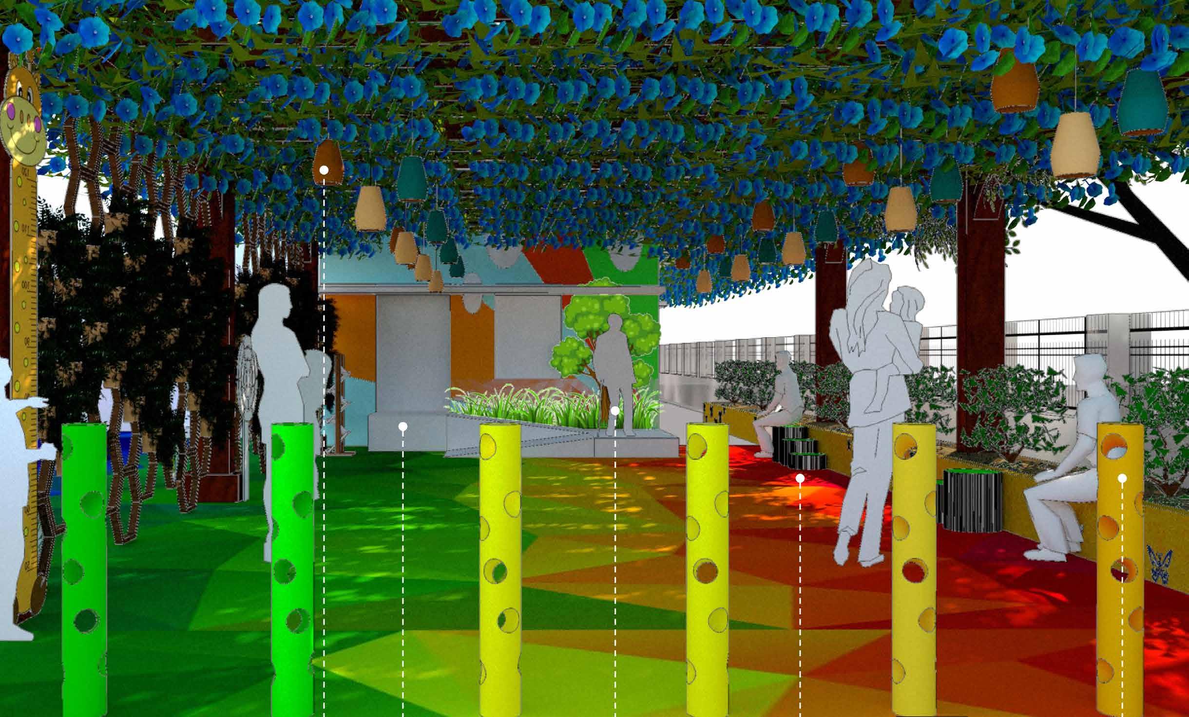 1. The firsts proposal is more vibrant and expensive, also most of the proposals are children oriented. the interventions make the place more intresting visually and physically. Special emphasis is given for flooring that is not permeable and the material is soft, where the childrens wont have the risk of getting hurt. the open space in Front of PHC is used for vehicle parking, to avoid that bollards have been prepared to reclaim the area as common place.