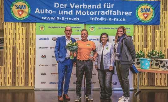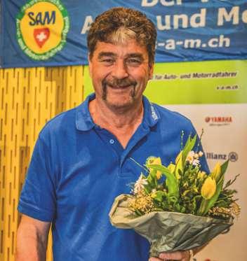 Ältere Semester kamen dann aber doch noch zu Ehren Nämlich Leute, die aufgrund ihrer 45-jährigen Mitgliedschaft zu SAM-Ehrenveteranen ernannt wurden (s. Box). Sie wurden mit Blumen und Geschenk bedacht, erhielten aber keine Anstecknadel. Was eine Frage aus dem Publikum zur Folge hatte Der Präsident musste gestehen, dass diese Ehrenpins vergessen wurden, aber nachgeschickt werden. Eine besondere Ehrung lag Roger Uhr am Herzen. Jörg Bucher tritt als Präsident von motosuisse zurück, dem Importeurverband der Zweiradbranche Er war in den letzten fünf Jahren ein verlässlicher Ansprechpartner