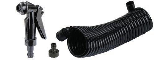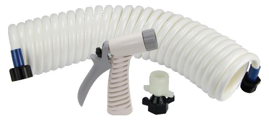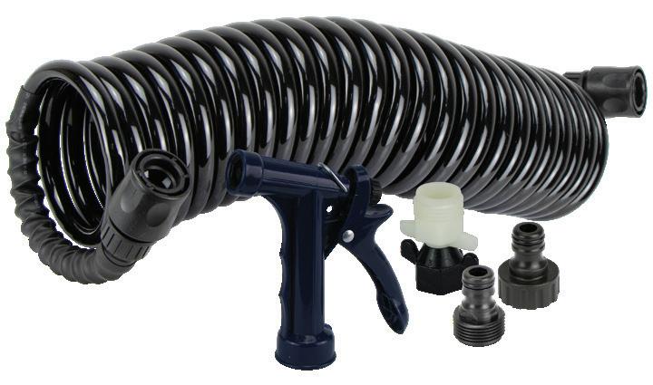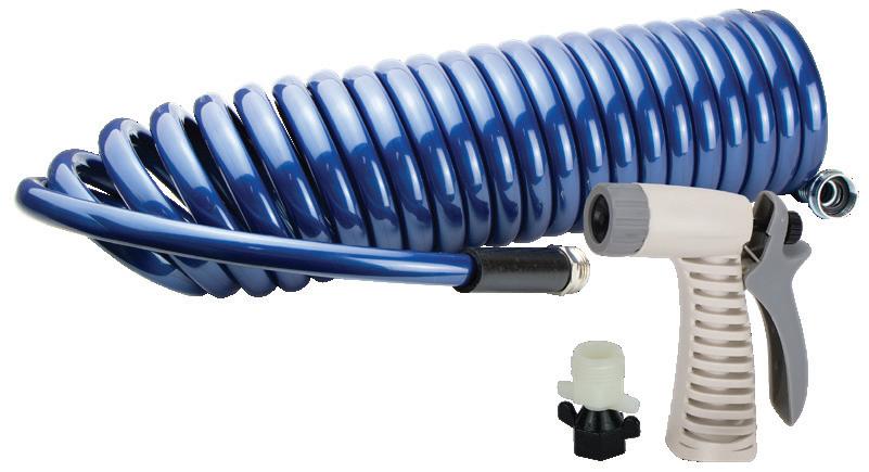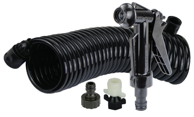 • Each kit includes self-coiling flexible hose, trigger style hose nozzle and 23982, 1/2" NPTF x 3/4" GHTM adaptor.