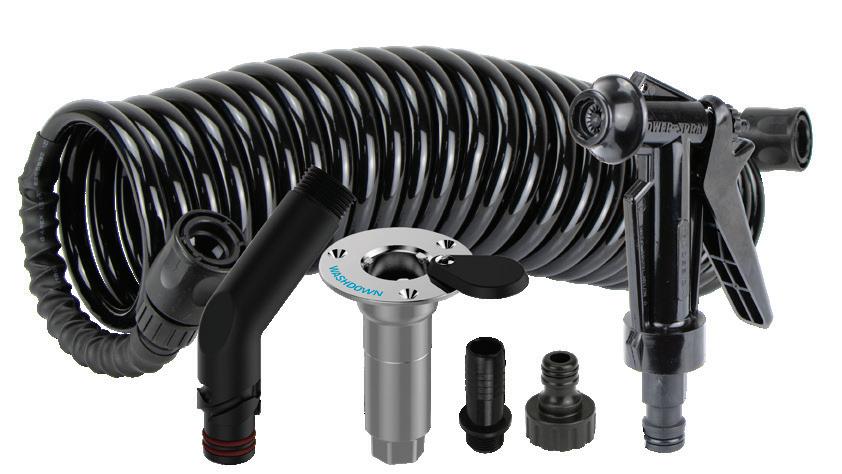 • Supplied with high quality nylon TruDesign® Power-Spray Nozzle with adjustable spray pattern for washdown and filling applications.