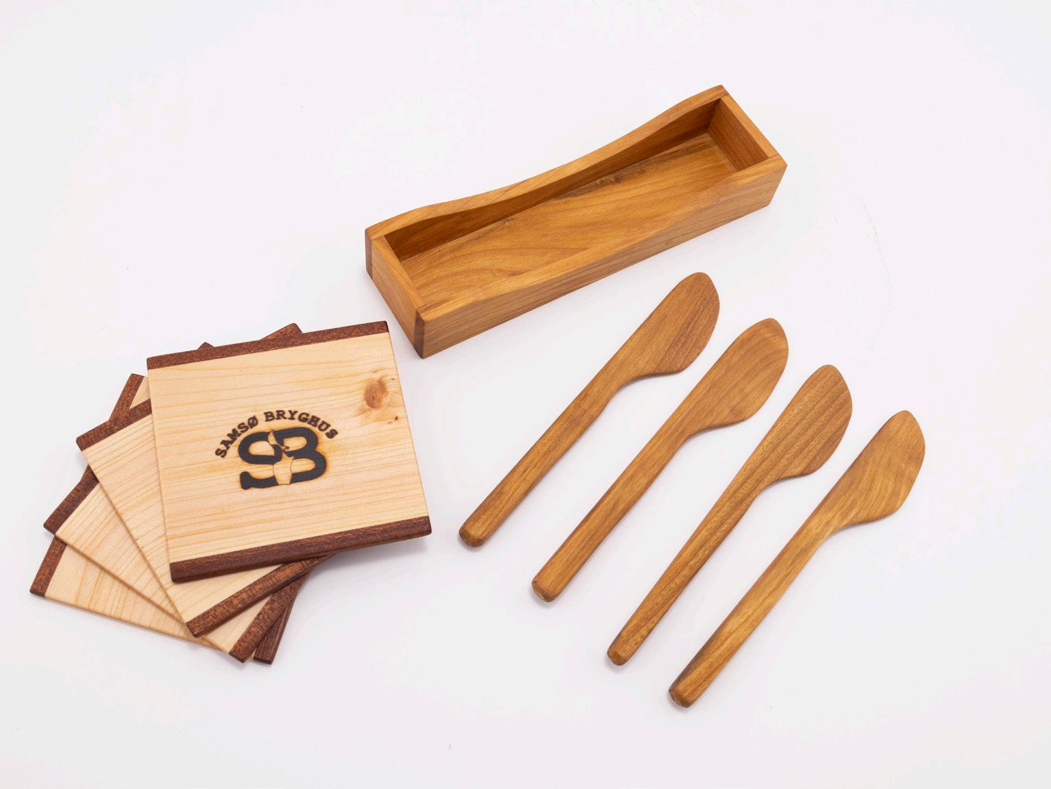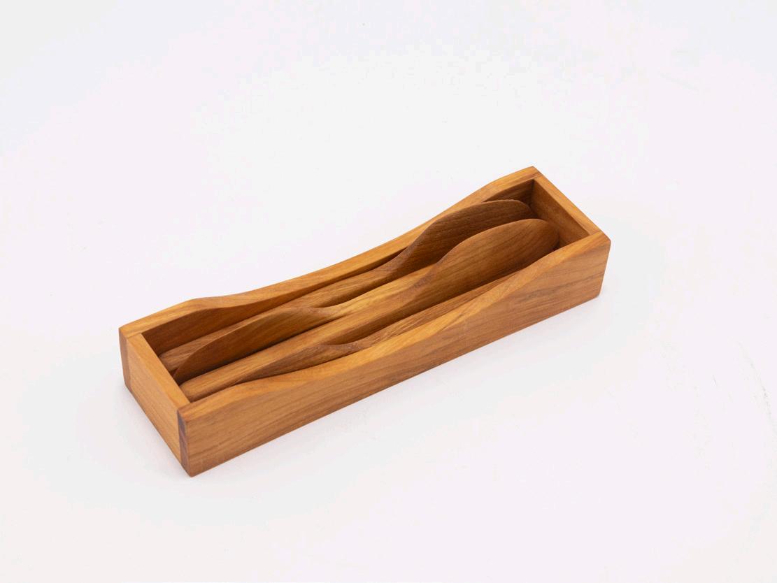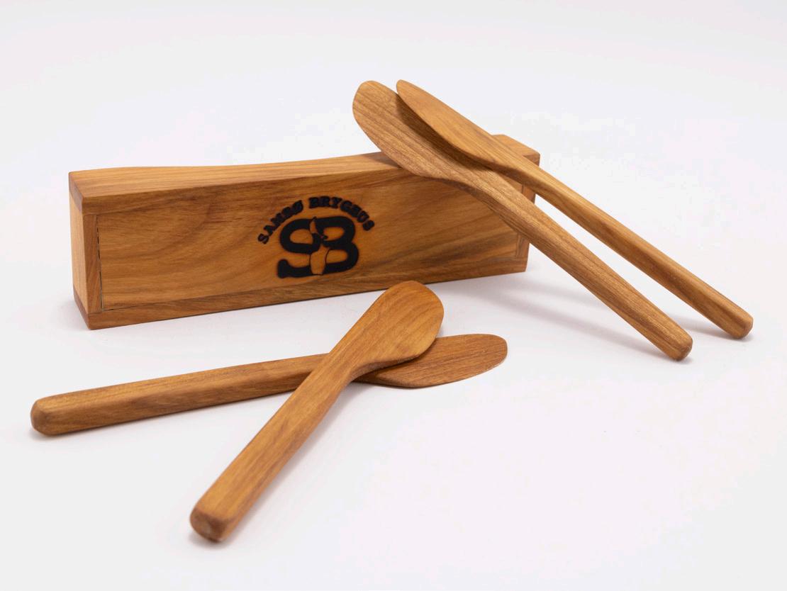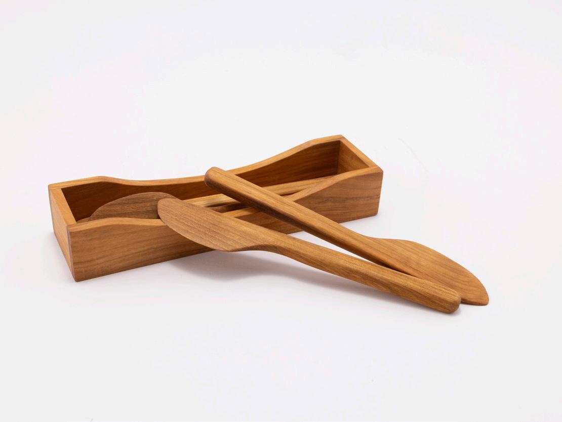 the butter knife kit, made from cherry wood, was first roughly cut by a bandsaw, which was then hand sanded to a desired shape and hand oiled. the case was measured to perfectly fit each of the four knives in an alternating pattern.