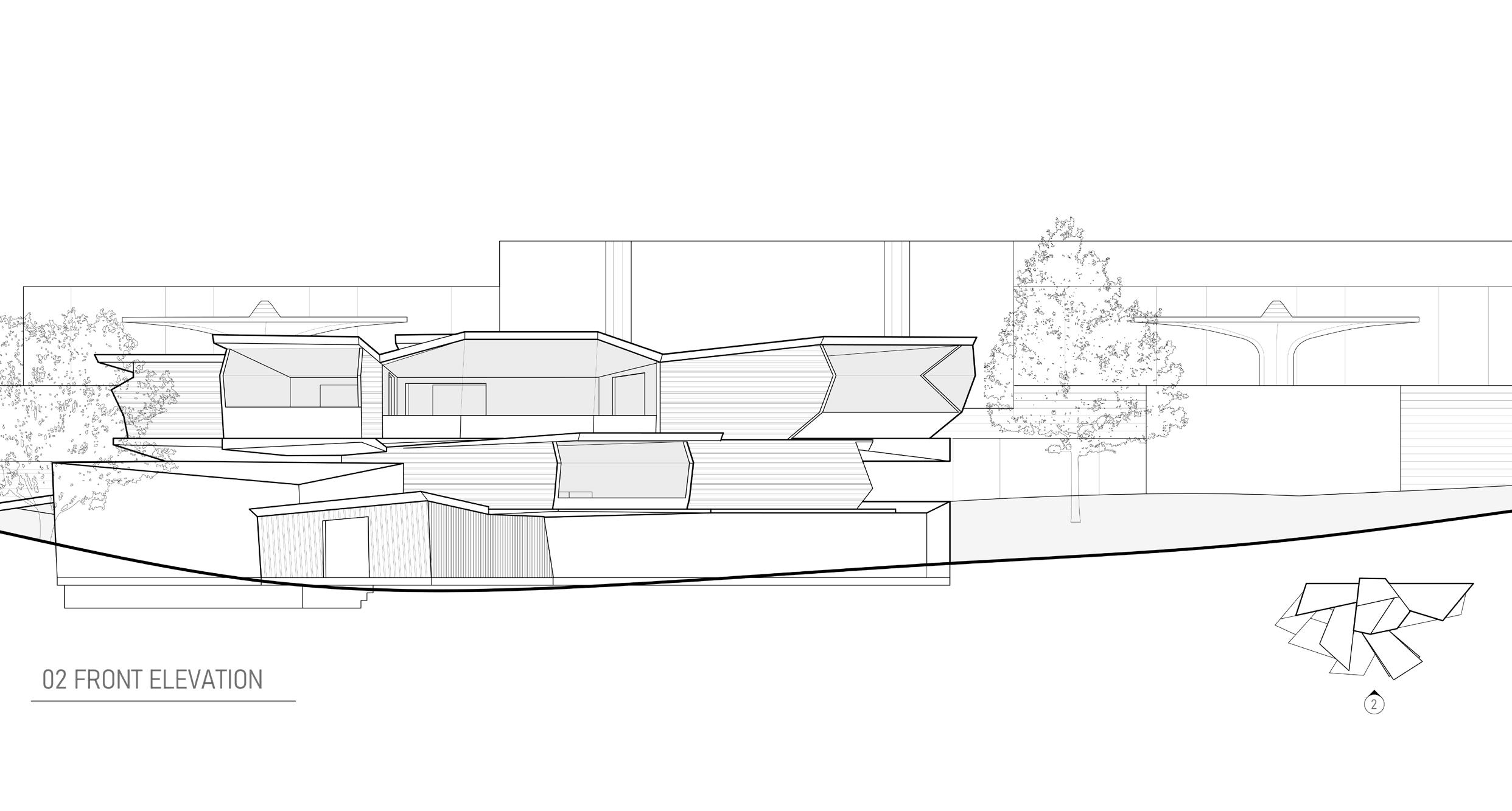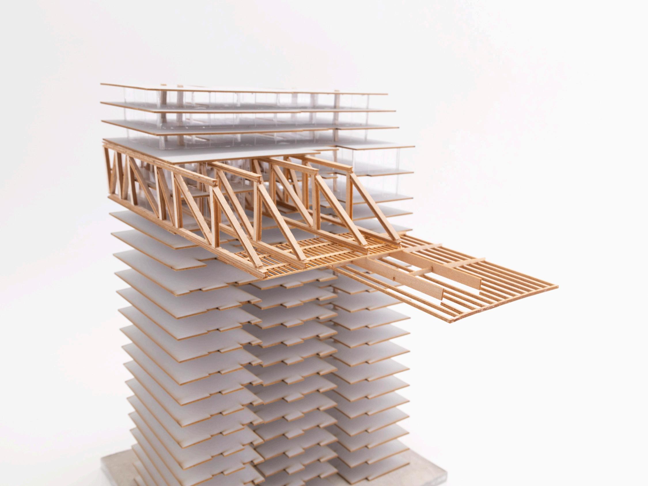 tap root is organized around a central core with modules cantilevered off it, creating a vertical extending circulation throughout the structure, with public spaces located around the root, and private spaces nested behind it.