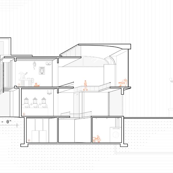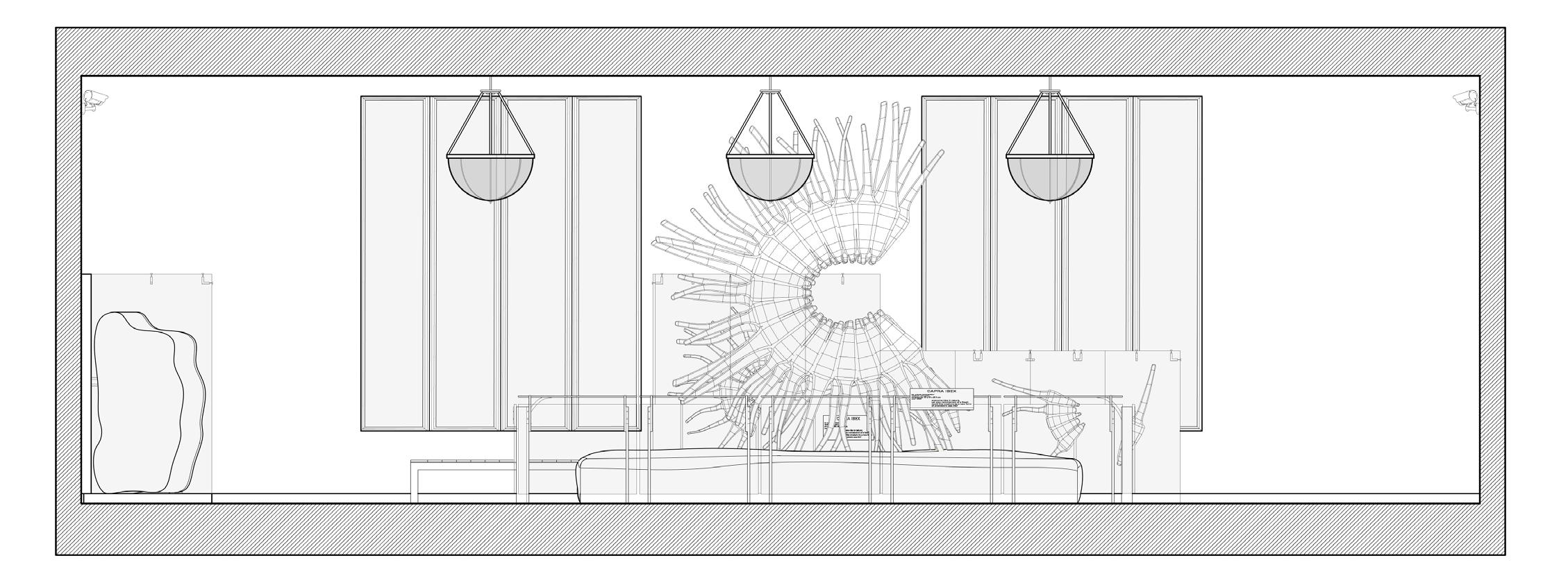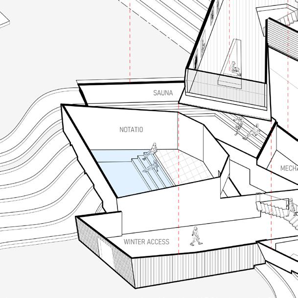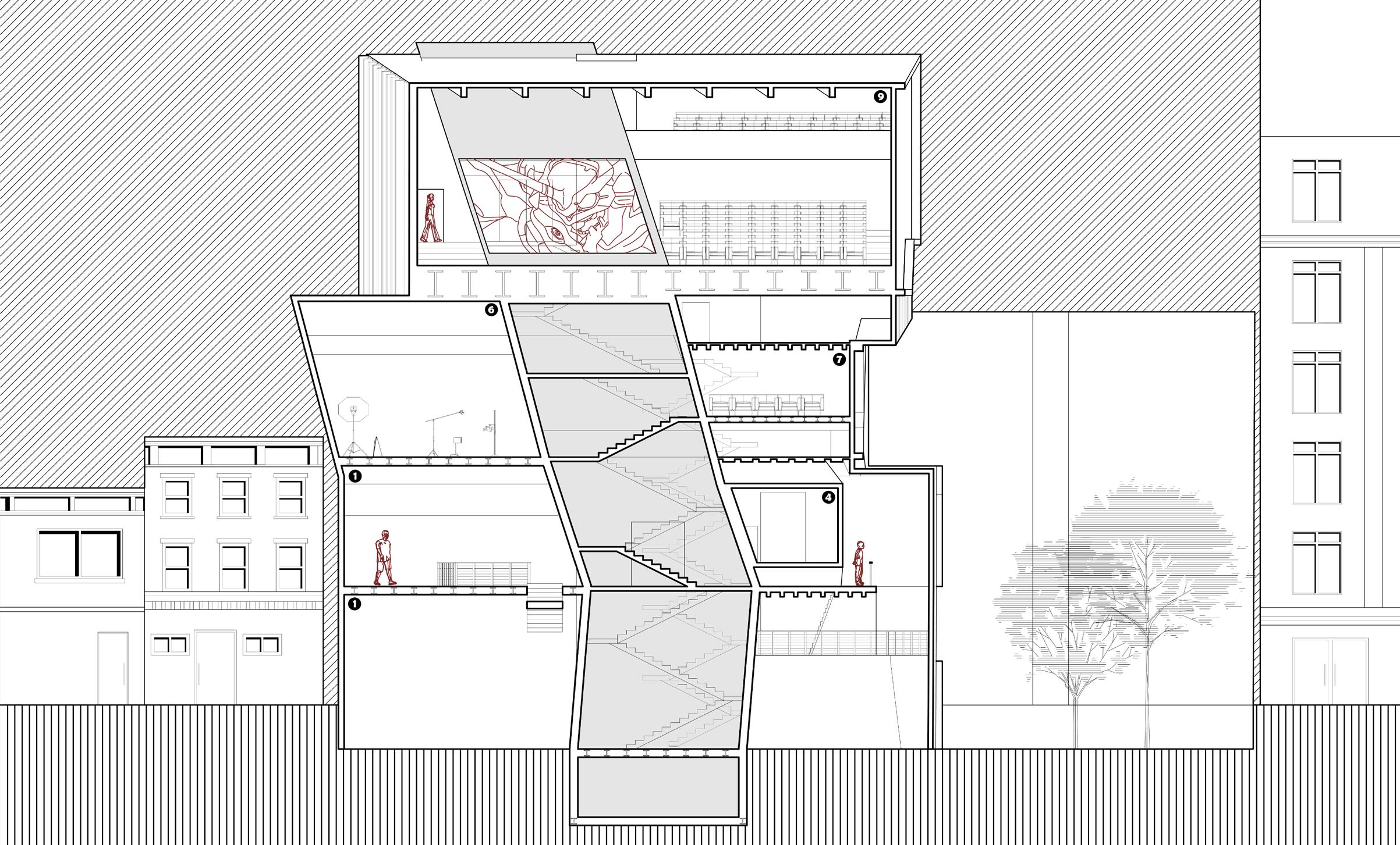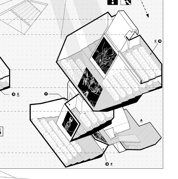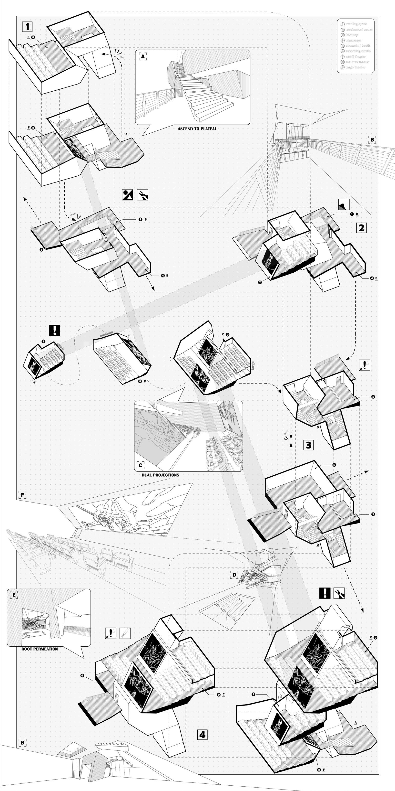 each theater space teases the barrier of the central root staircase, featuring a screen visible both to the movie viewers on one side as well as those circulating on the other.