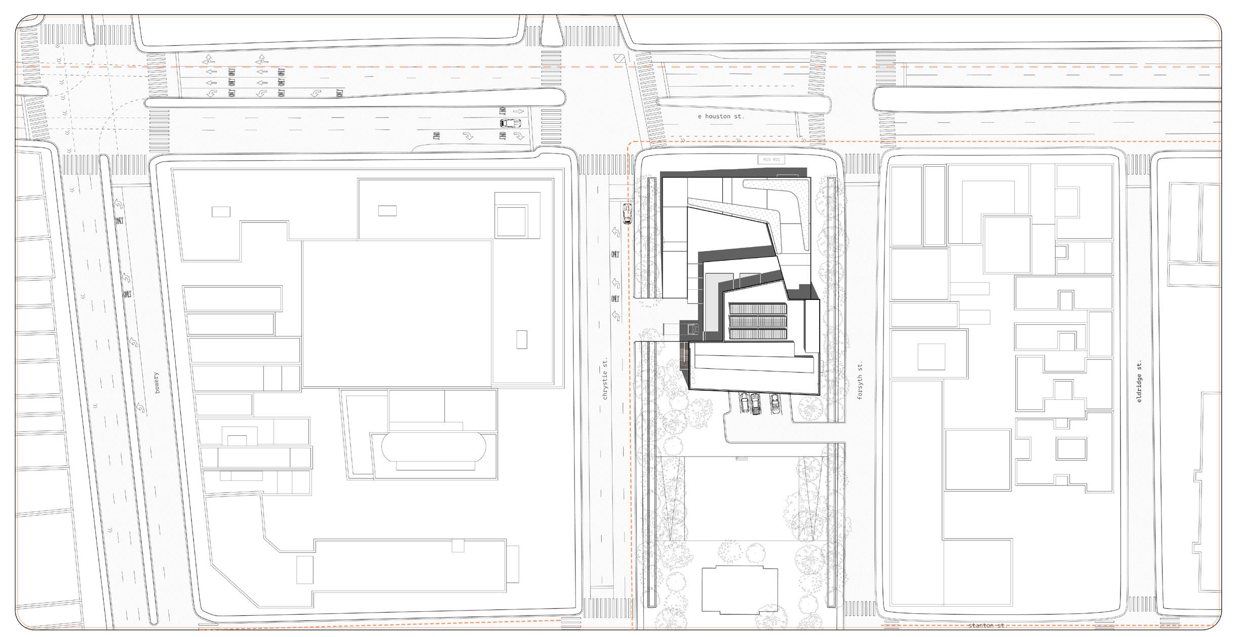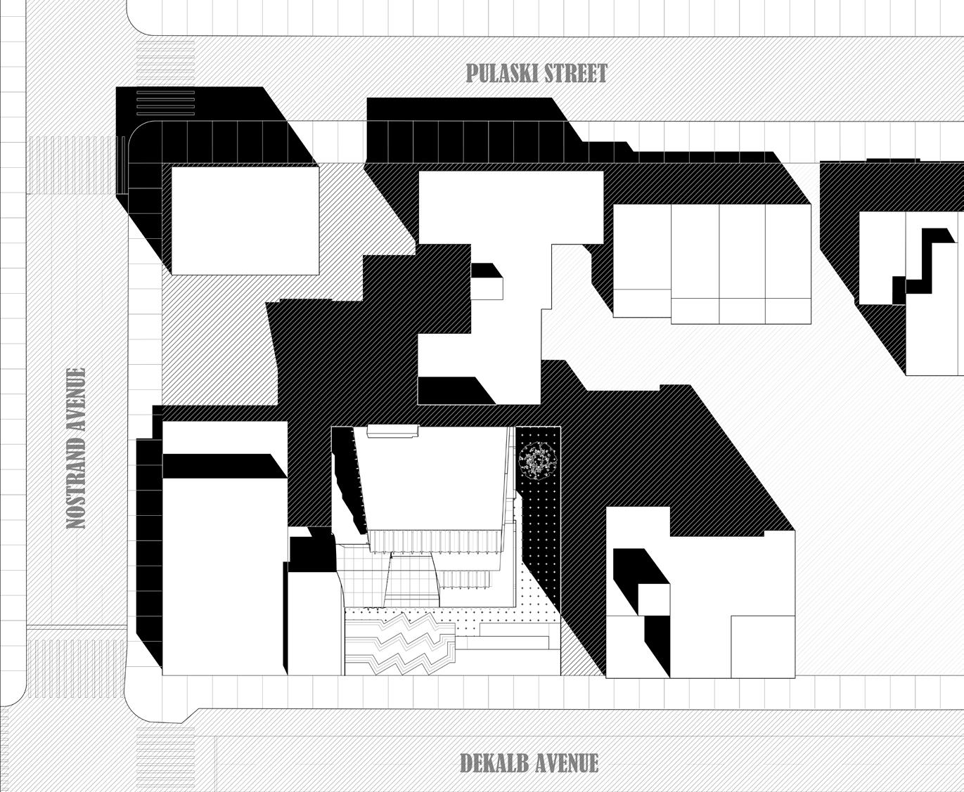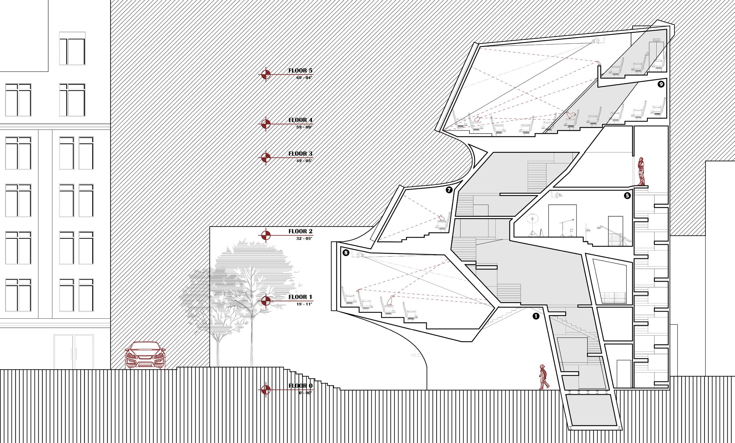 an extension to and renovation of a nyc public library as an audio visual education center. this cinamatheque pushes and pulls against the public boundary, playing with the juxtaposition of the public and private spaces surrounding the site.