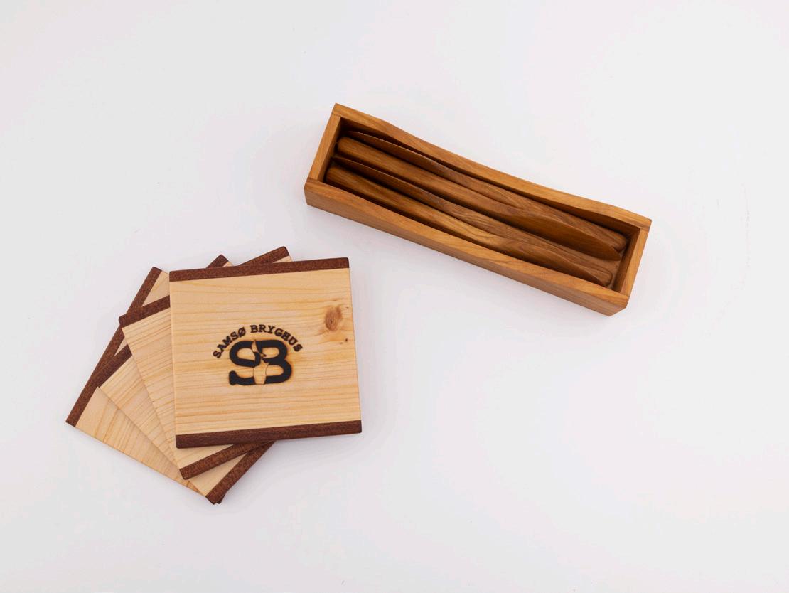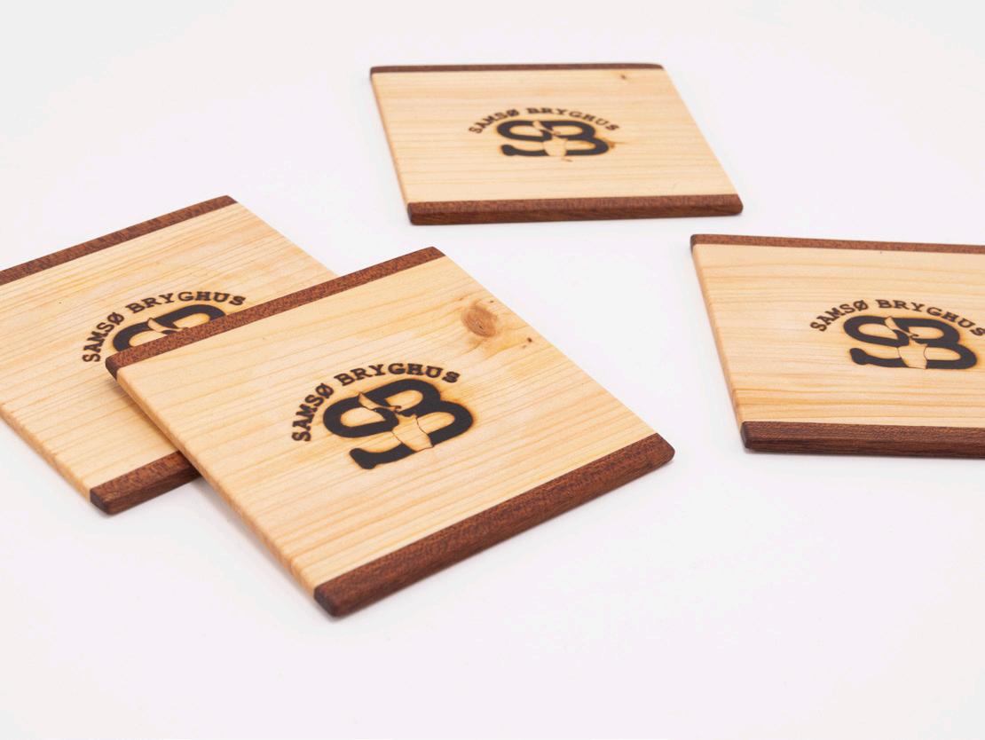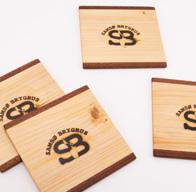 the coasters were made by joining pine and bubinga wood, which were then put through a wood planer, branded, and hand oiled.