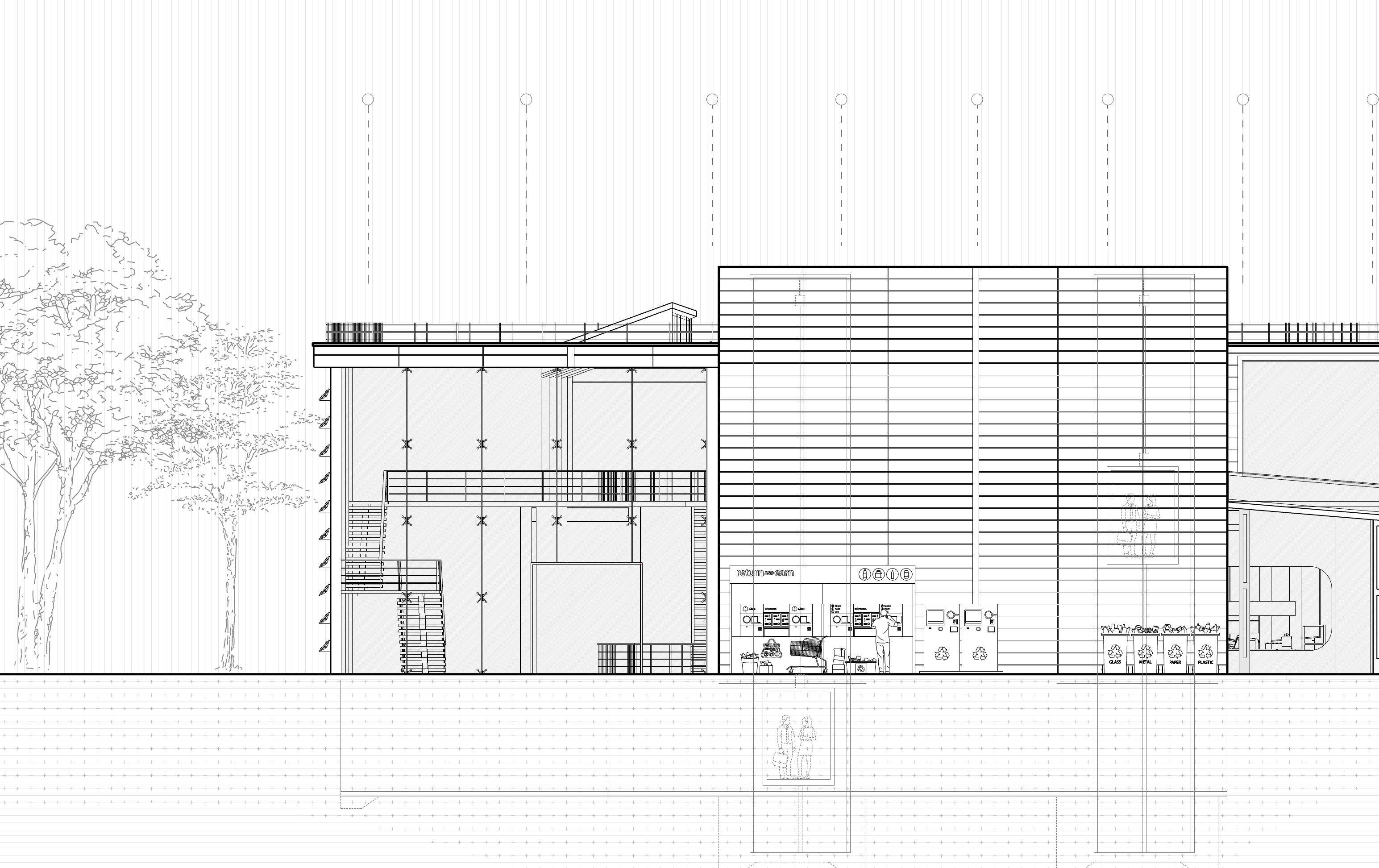 located in lower east manhattan on the northern block of sara d roosevelt park, this market and community learning center utilizes a ramping roof structure which serves as an organic continuation of the current park scape.