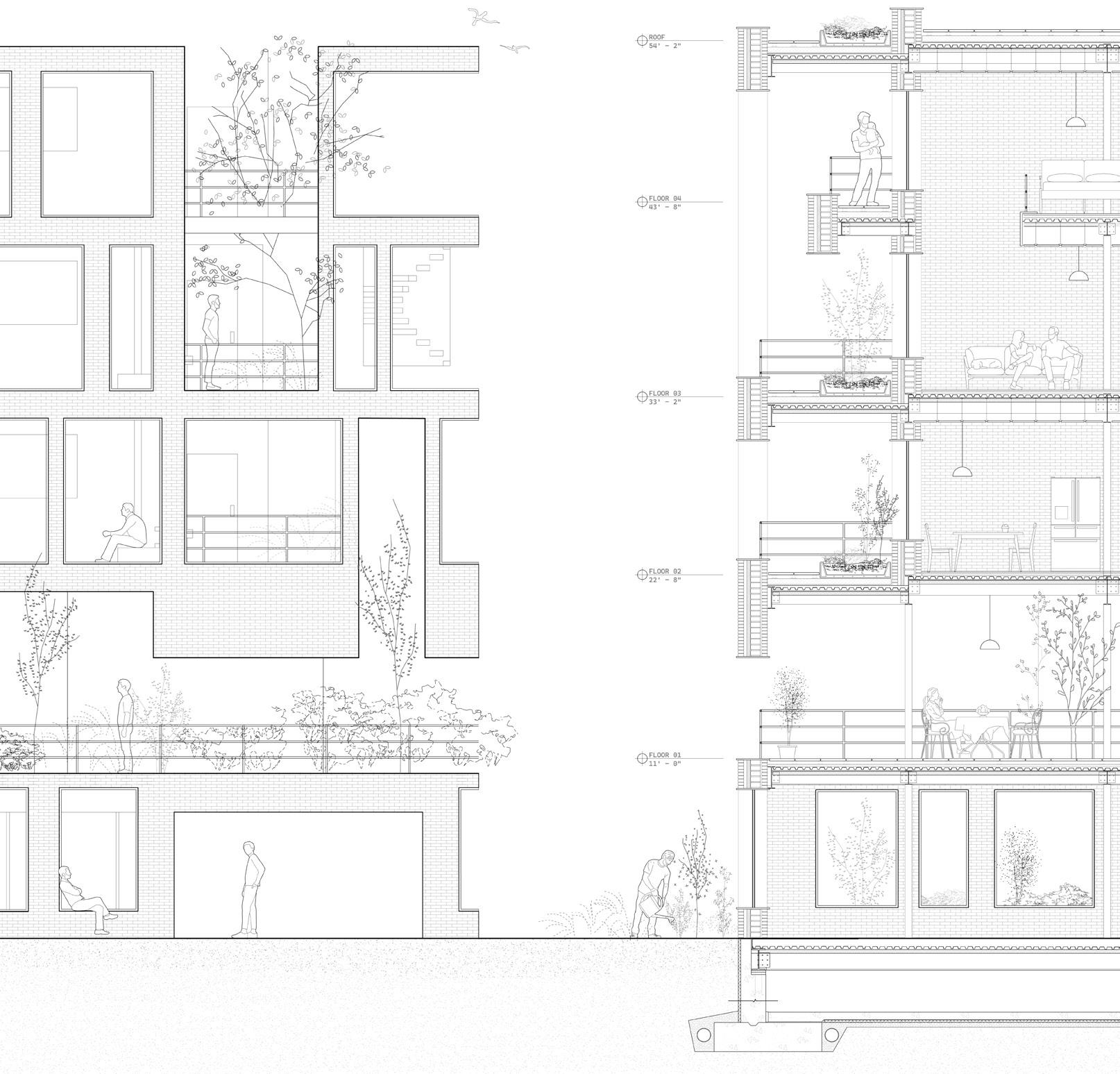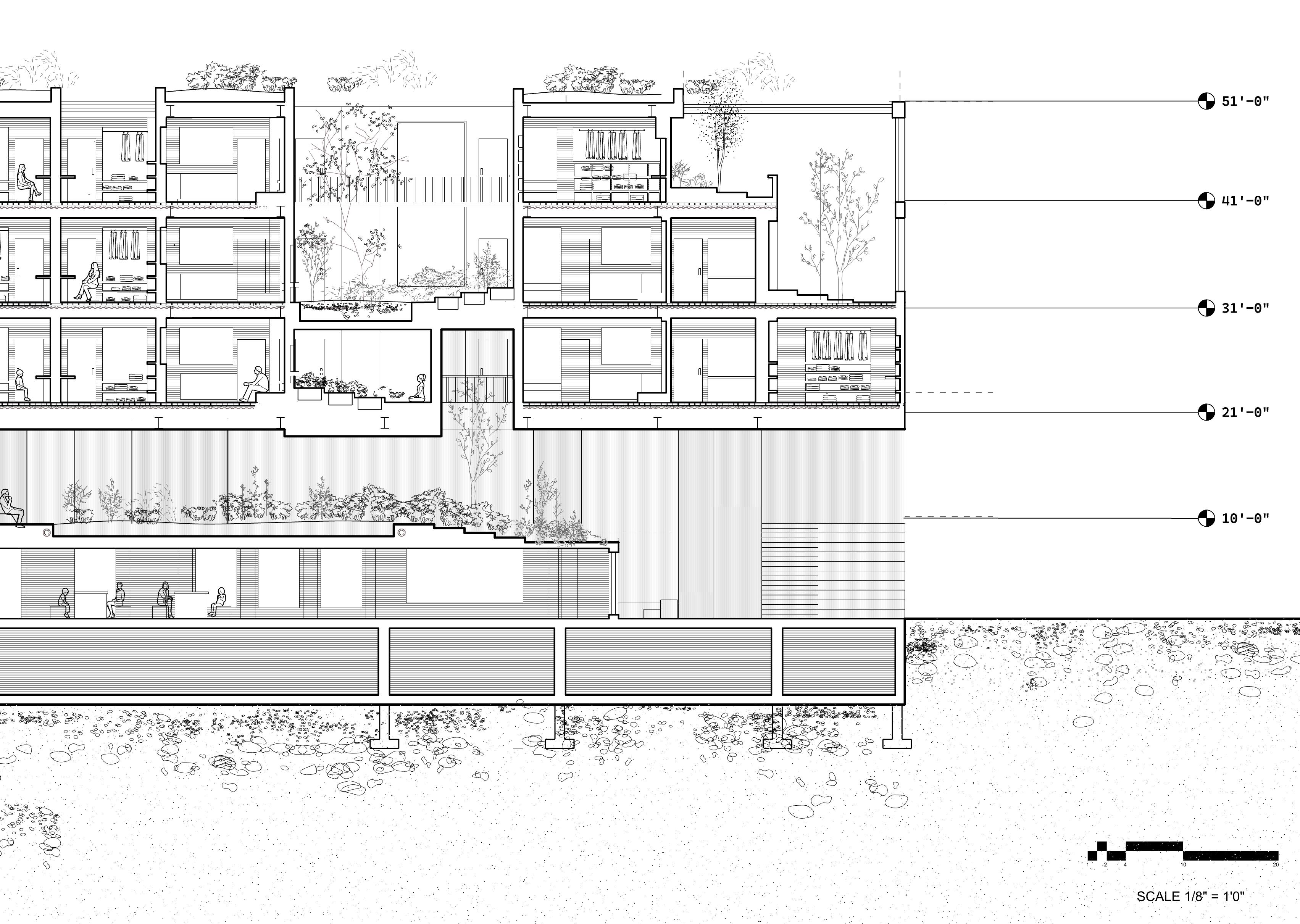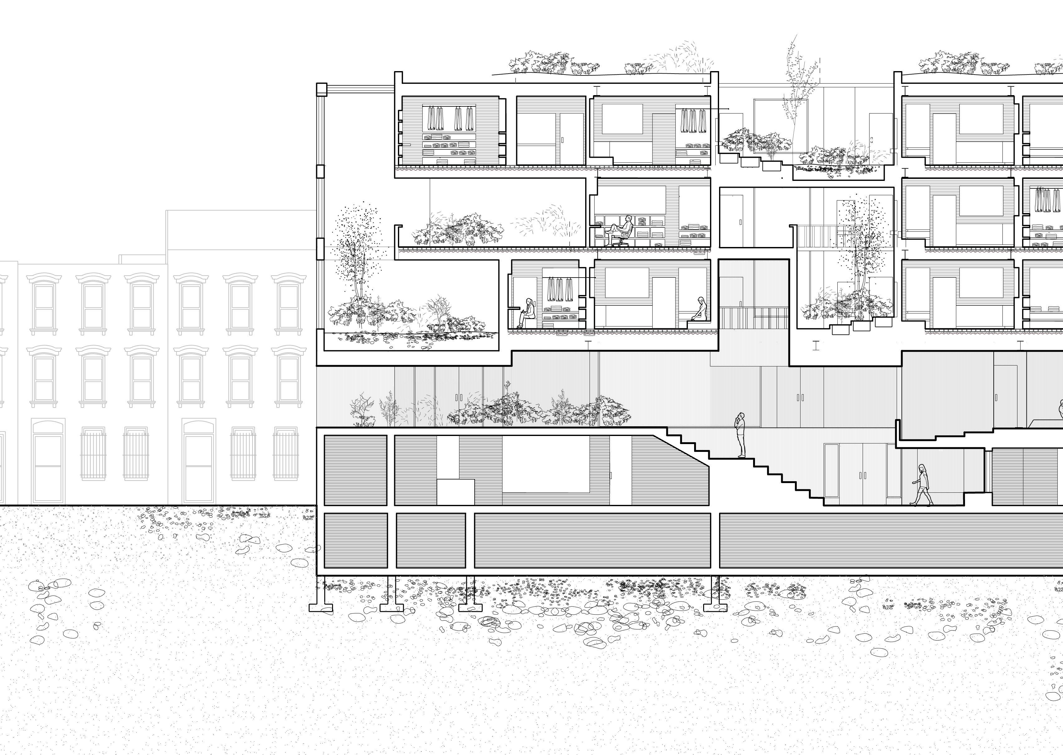 The long section of this building illustrates the journey of the park as it flows up and into the residential space. Two grand staircases serve as dynamic, topographical features , lifting the park’s landscape from the street to a second-floor park level that weaves through the building’s interior. This terraced green space continues to ascend through the three residential floors, connecting duplex units with pockets of greenery