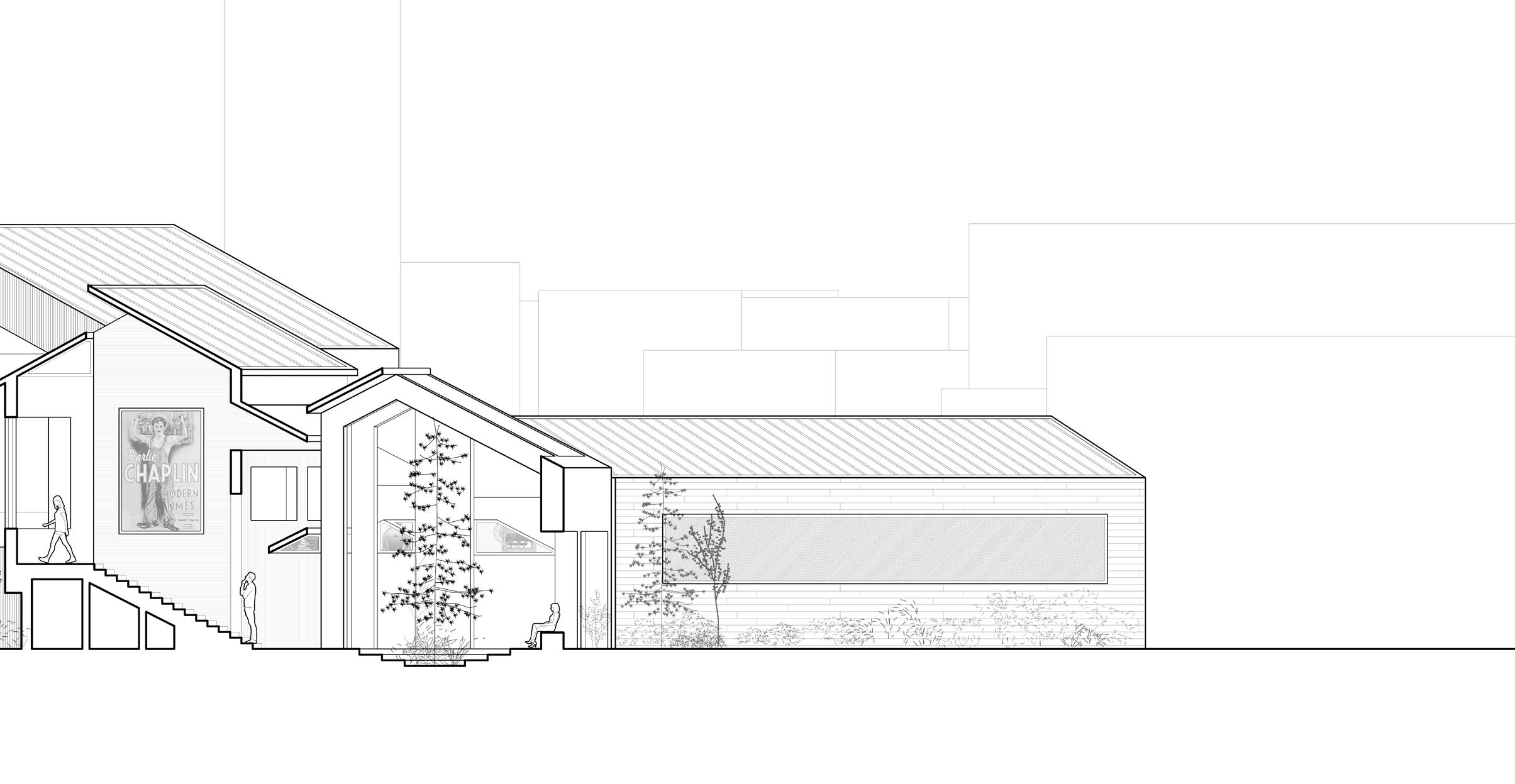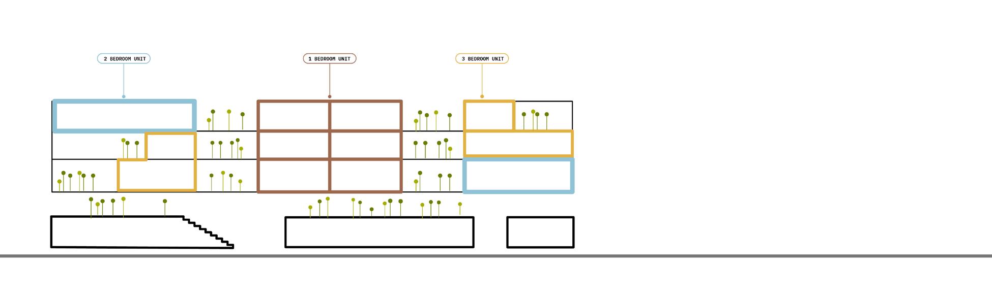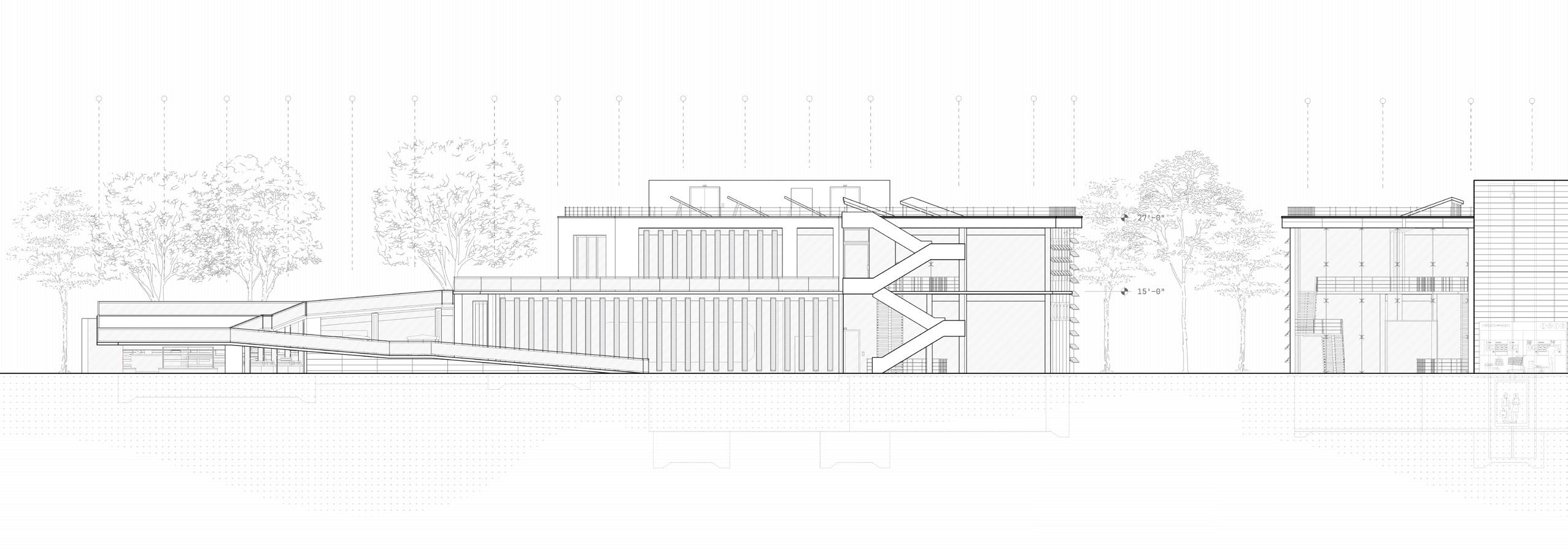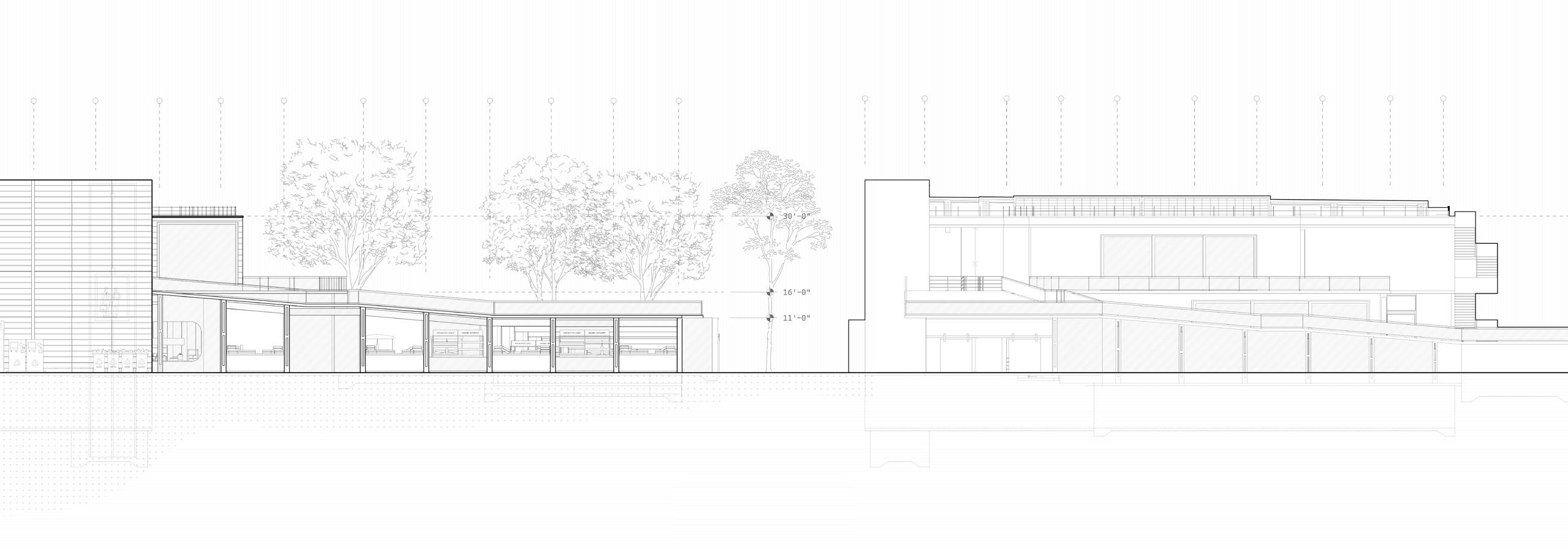 The long section of this building illustrates the journey of the park as it flows up and into the residential space. Two grand staircases serve as dynamic, topographical features , lifting the park’s landscape from the street to a second-floor park level that weaves through the building’s interior. This terraced green space continues to ascend through the three residential floors, connecting duplex units with pockets of greenery