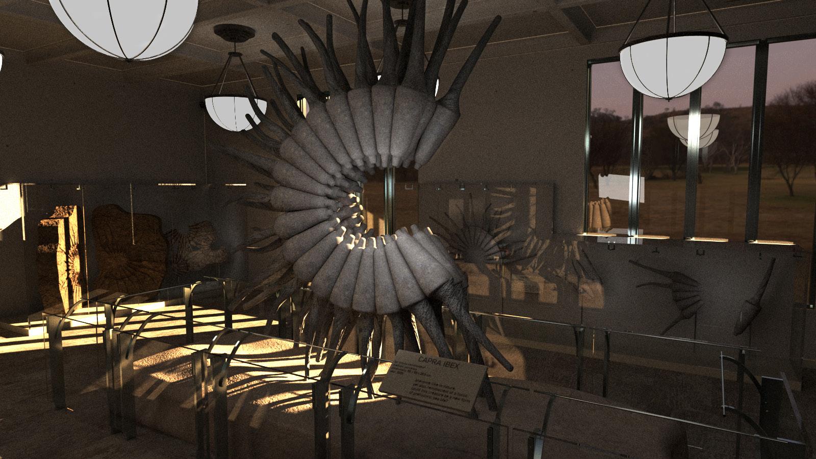 Drawing inspiration from Ursula Commandeur’s intricate ceramic work, this conceptual installation is set within a digitally crafted environment reminiscent of the fossil exhibit at the Museum of Natural History. Every detail of this environment was meticulously modeled , from the glass railings to the showcase containers, capturing a museum-quality level of realism . Using V-Ray, I applied custom textures and lighting to enhance the space’s tactile depth, followed by detailed post-processing in Photoshop, resulting in a visually rich, immersive presentation that highlights the artistic intersection of nature and design.