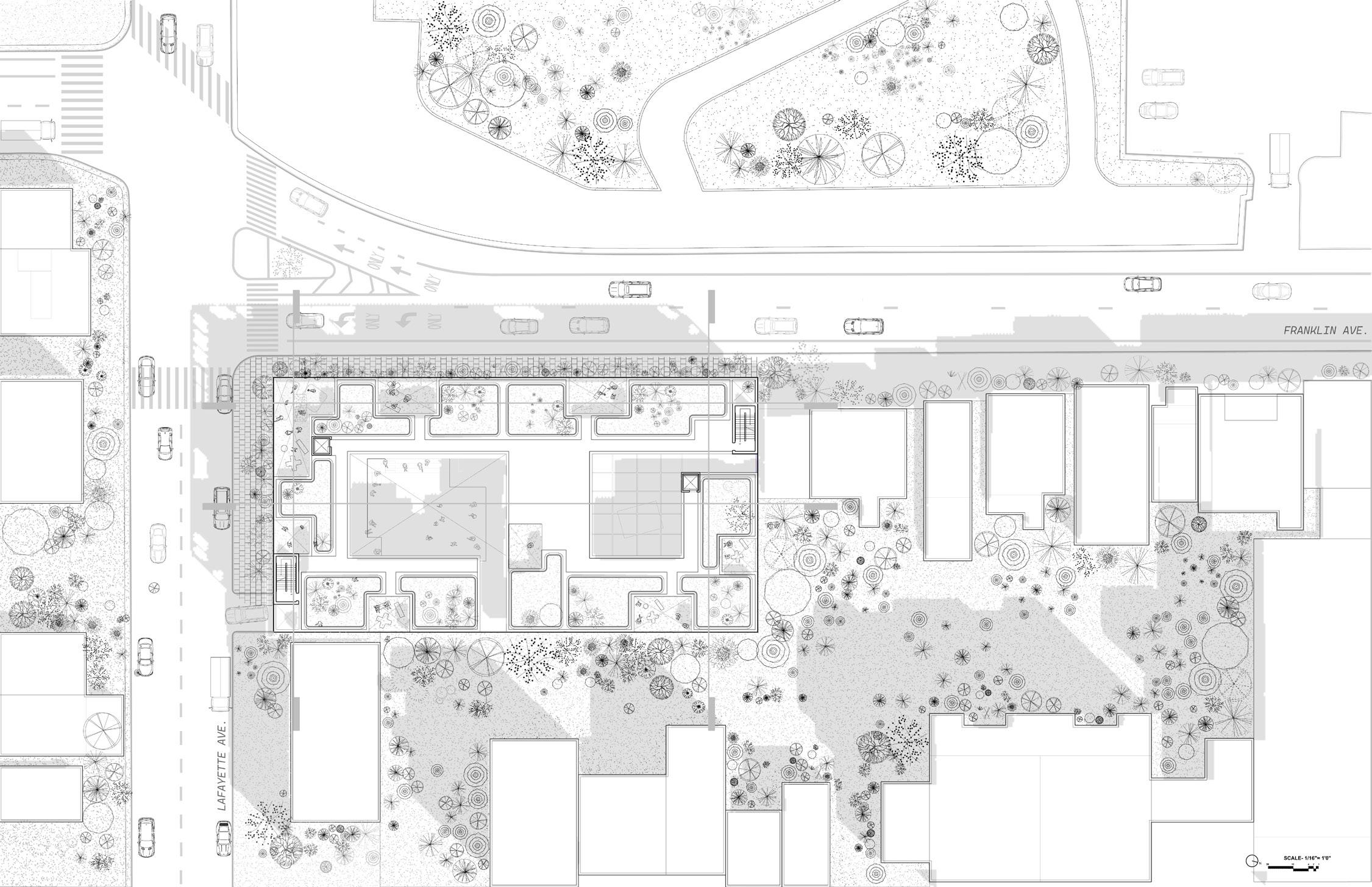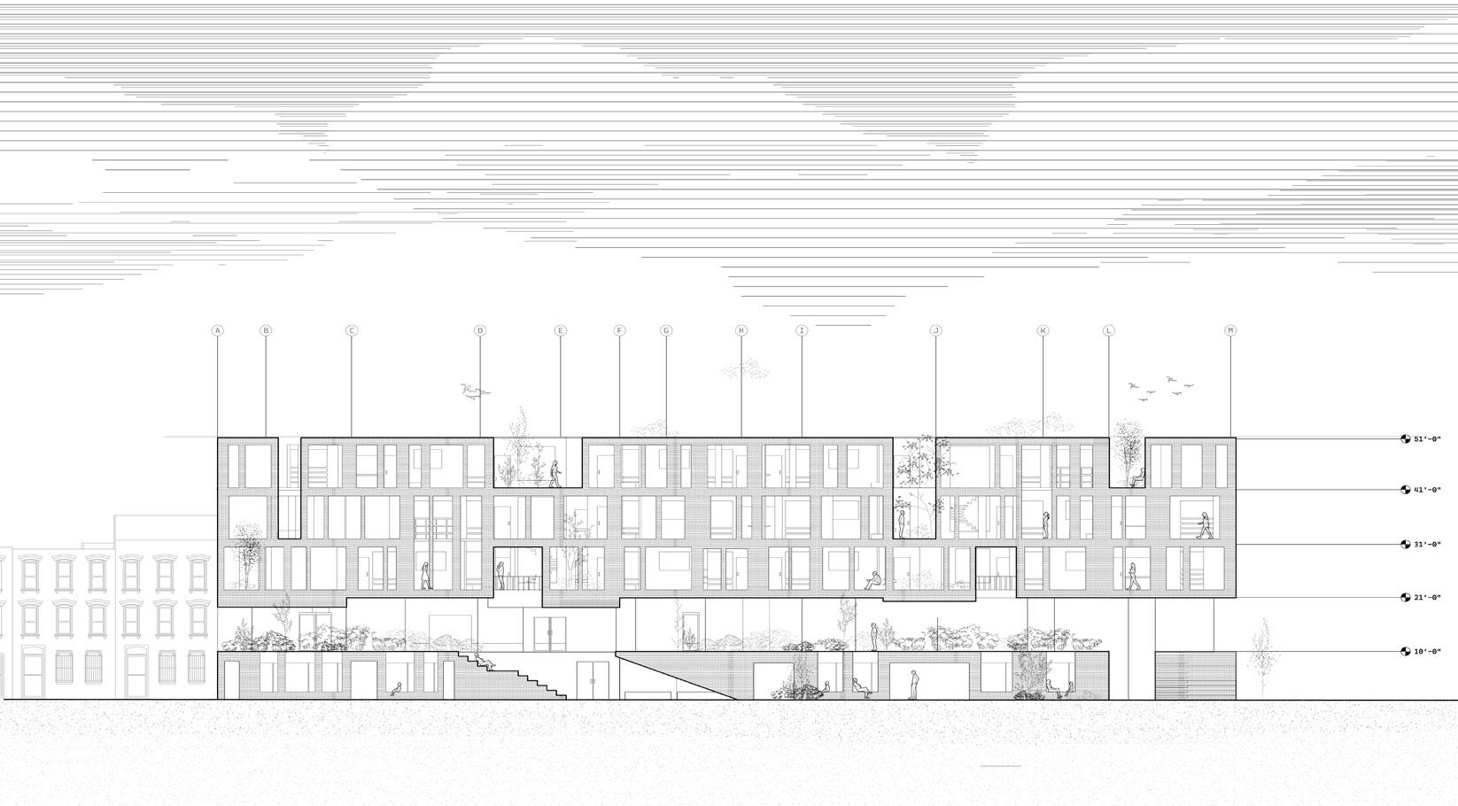 Located directly across from the Lafayette Gardens Playground, this multigenerational housing project celebrates the connection between urban living and nature , responding thoughtfully to the surrounding environment and community needs. The vision for this building is rooted in the desire to bring the park “in and up,” integrating natural elements across different floors and levels of the structure. By drawing from the brownstone typologies and the varied height levels of neighboring mixed-use buildings, this design honors the architectural vernacular while introducing contemporary spaces where families can thrive across generations. Windows puncture the building’s form, framing views that link the interior spaces to the park outside and allowing daylight to animate the facade.