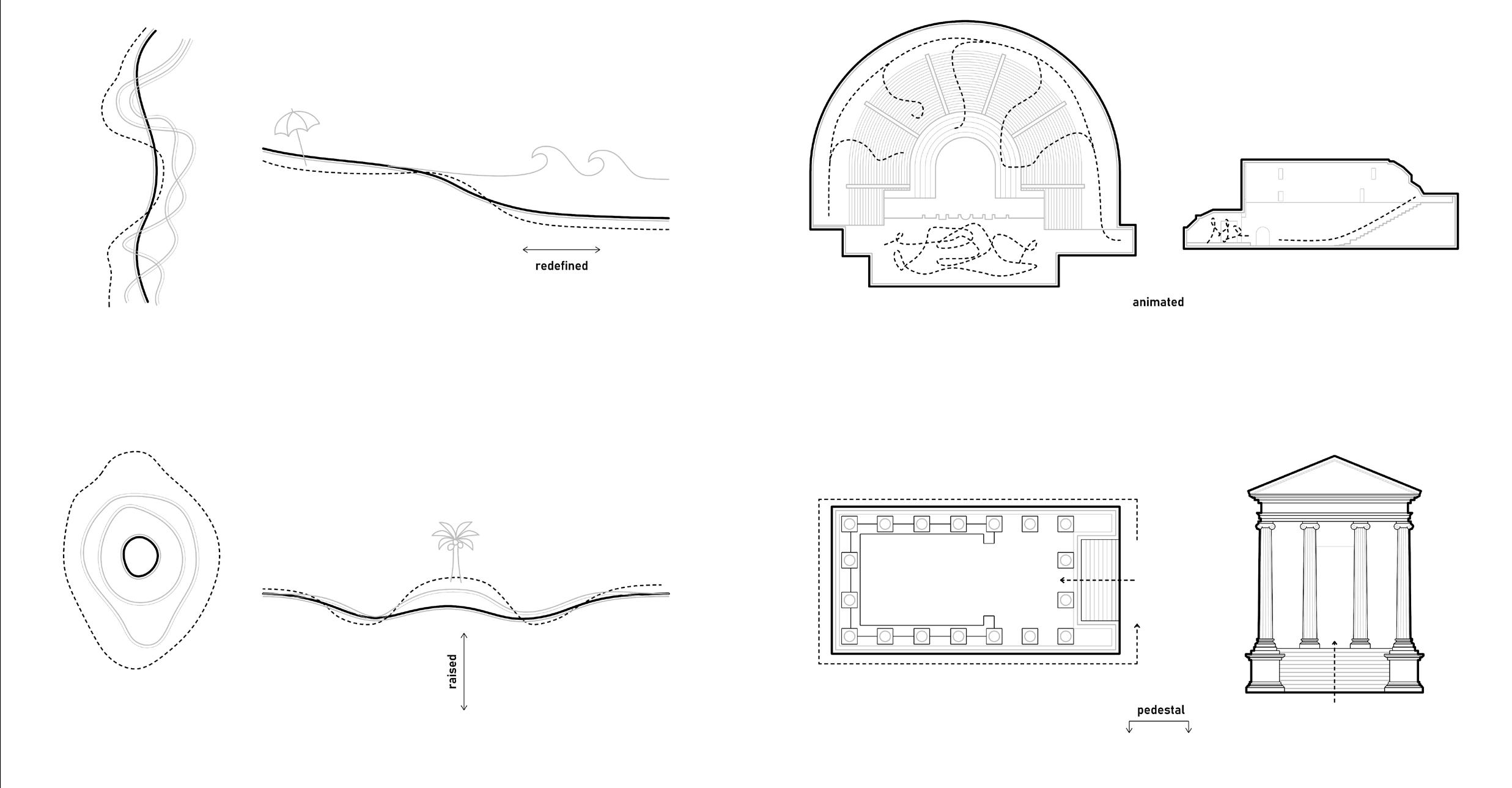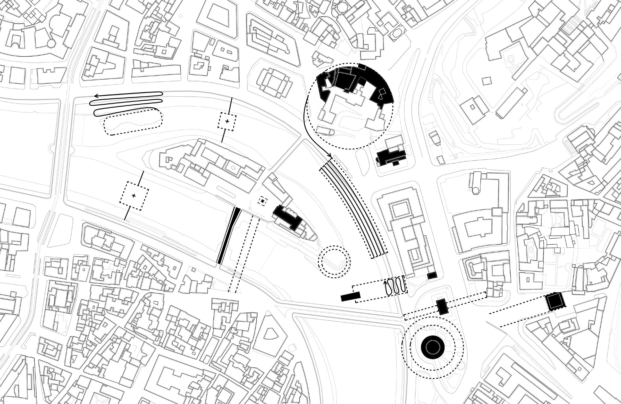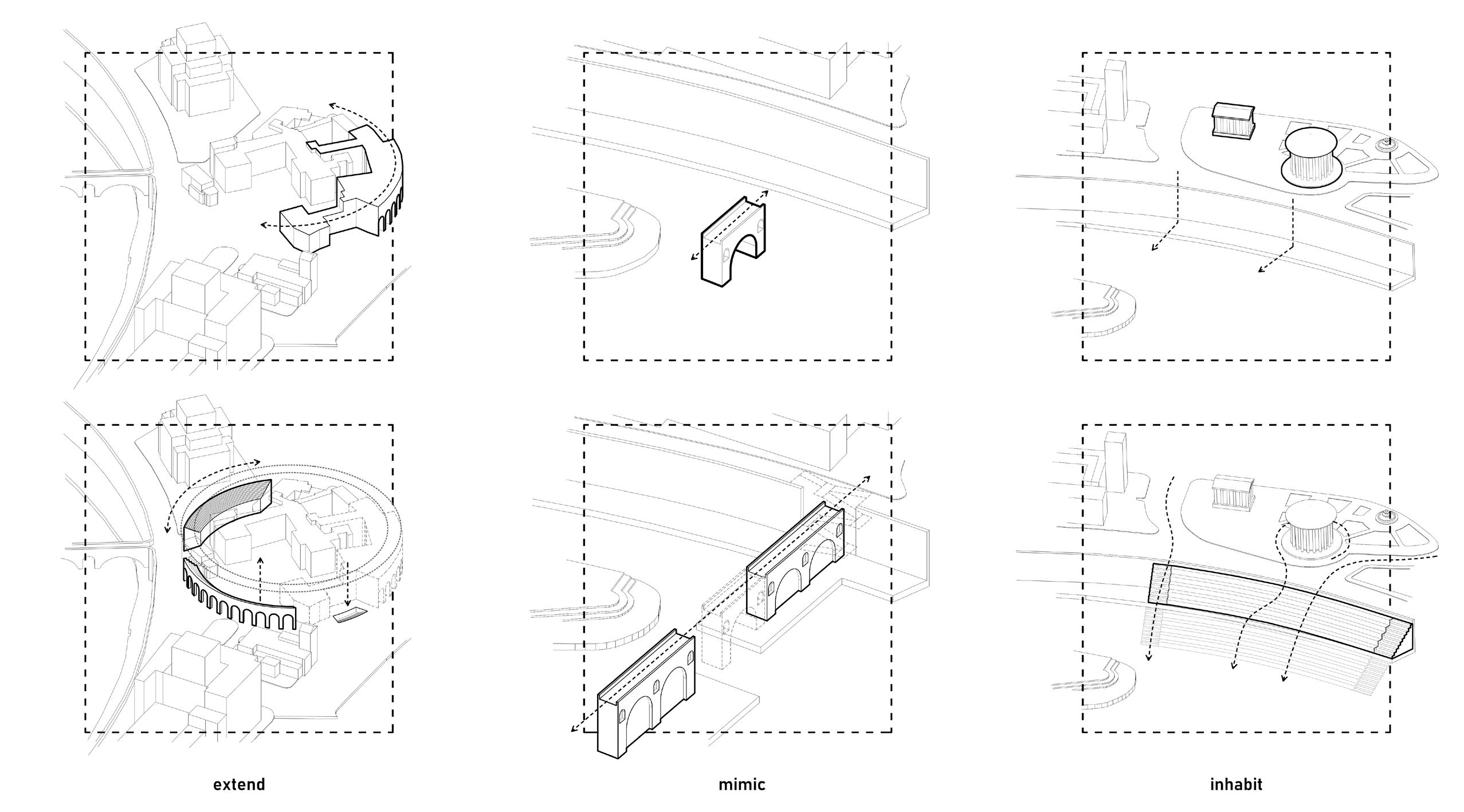 Using three generative strategies—” extend ”, “ mimic ”, and “ inhabit ”—the design aims to reactivate lost or fragmented spaces. “Extend” expands a monument’s original footprint, reconstructing what has been lost, such as completing the circular plan of the Theater of Marcellus. “Mimic” duplicates elements of a ruin, allowing for playful reinterpretations, like reinhabiting Ponte Rotto. “Inhabit” reactivates erased urban fabric , particularly where the embankment walls severed connections to the river.
